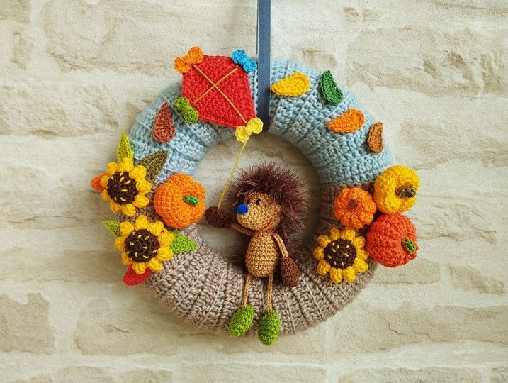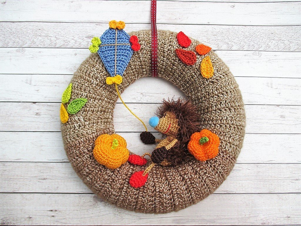 Die ausführliche Häkelanleitung zeigt Dir auf 20 Seiten mit insgesamt 76 Bildern, wie Du Dir den herbstlichen Türkranz inklusive aller Kleinteile + Igel häkeln kannst.