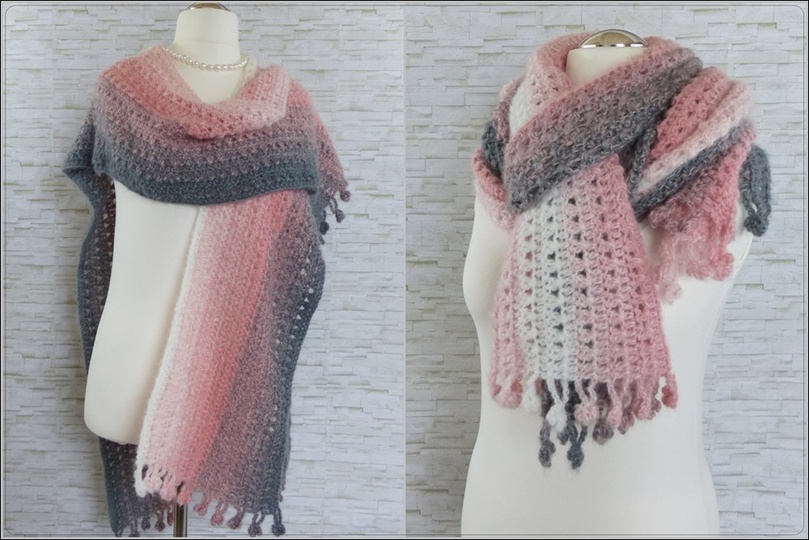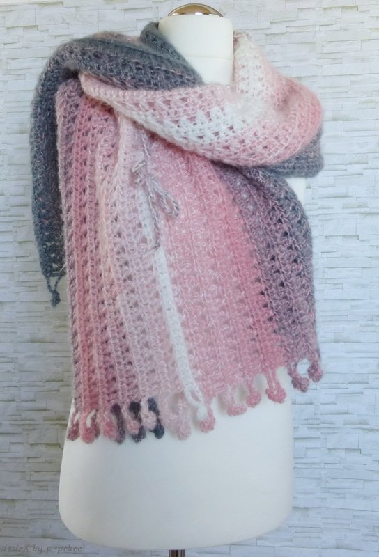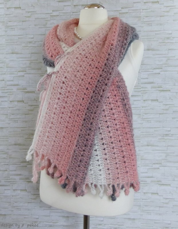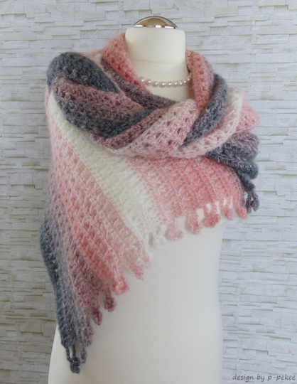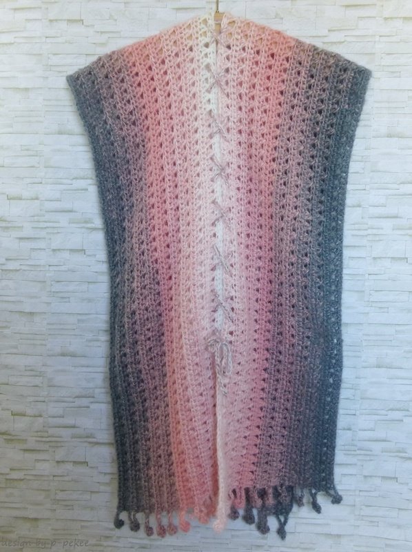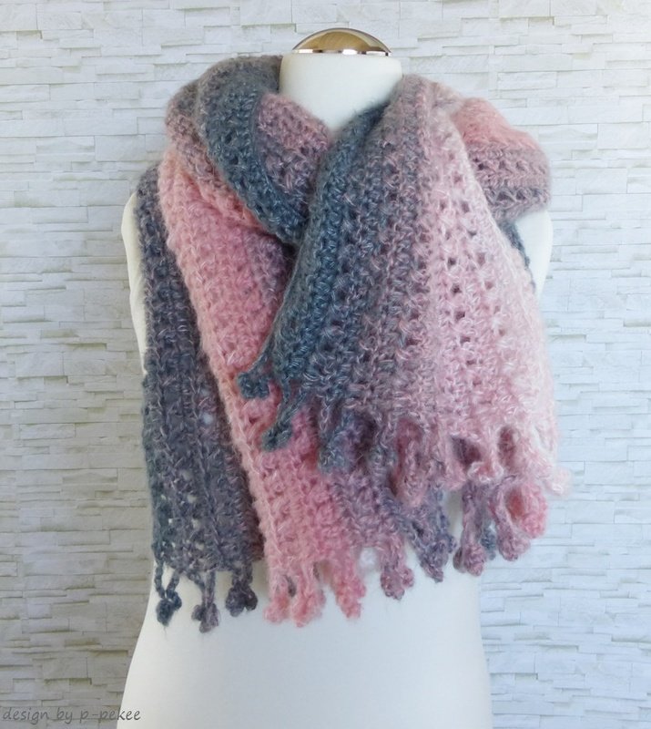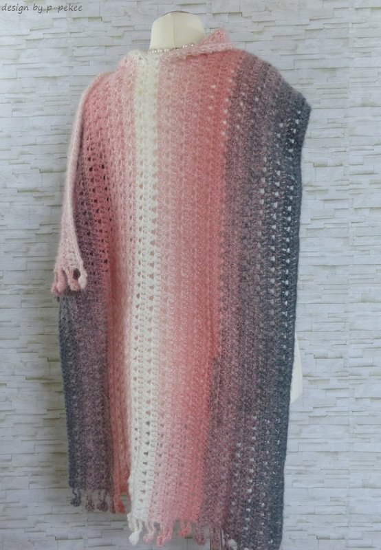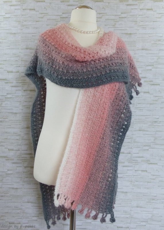 Der Schal ist mittig geteit und mit einer Schlaufe verbunden. Er kann in der Breite verändert werden und somit auch als Poncho/Überwurf getragen werden. Mit der Farbverlaufswolle in Mohair ist er schön fluffig und weich - ein absolutes Lieblingsstück!