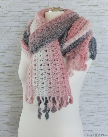 Das Muster ist leicht zu häkeln ist, daher ist der Schal auch sehr schnell gehäkelt. Die Fransen werden gleich Reihe für Reihe angehäkelt, jede Franse hat somit eine andere Farbe.