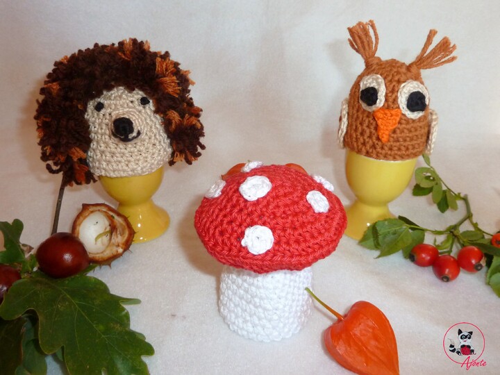 Das Set "Herbstliche Eierwärmer" besteht aus dem süßen Igel Igor, einem Fliegenpilz und der Eule Ewald.