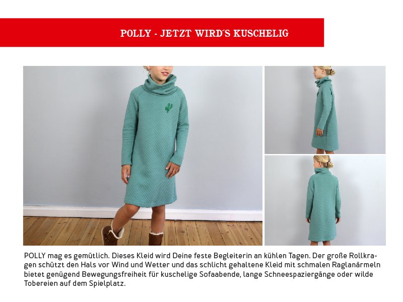 POLLY mag es gemütlich. Dieses Kleid wird Deine feste Begleiterin an kühlen Tagen. Der große Rollkragen schützt den Hals vor Wind und Wetter und das schlicht gehaltene Kleid mit schmalen Raglanärmeln bietet genügend Bewegungsfreiheit für kuschelige Sofaabende, lange Schneespaziergänge oder wilde Tobereien auf dem Spielplatz.