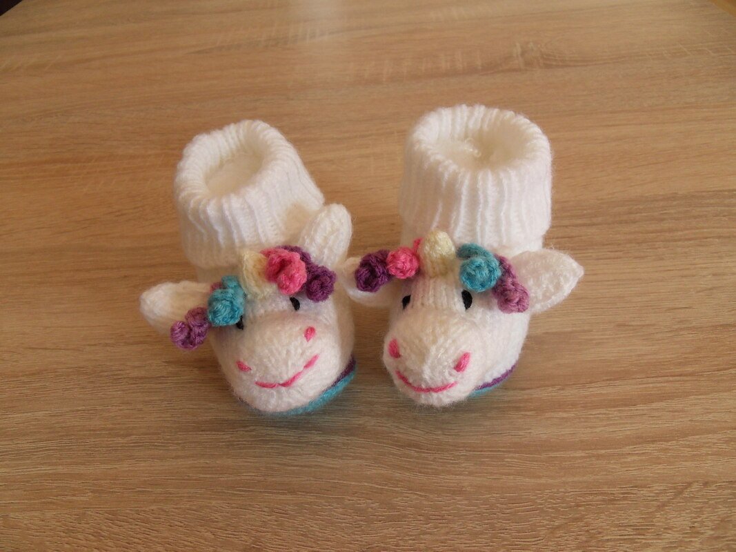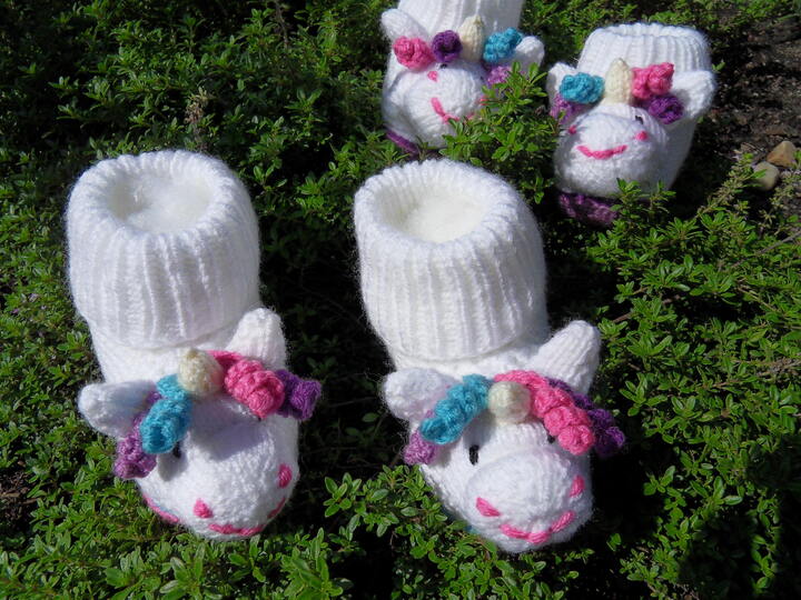 Diese süßen Einhorn Babyschühchen kannst du in drei Größen arbeiten. Die kleinsten sind ca. 9 cm, die mittleren sind ca.11cm und die großen sind ca.13cm. Sie sind aus der Baby Smiles Wolle von Schachenmayr gearbeitet. Sie lassen sich mit 40°C im Wollwaschprogramm waschen. Die Schuhe werden zum großen Teil gehäkelt nur das Bündchen und das Gesicht wird gestrickt.