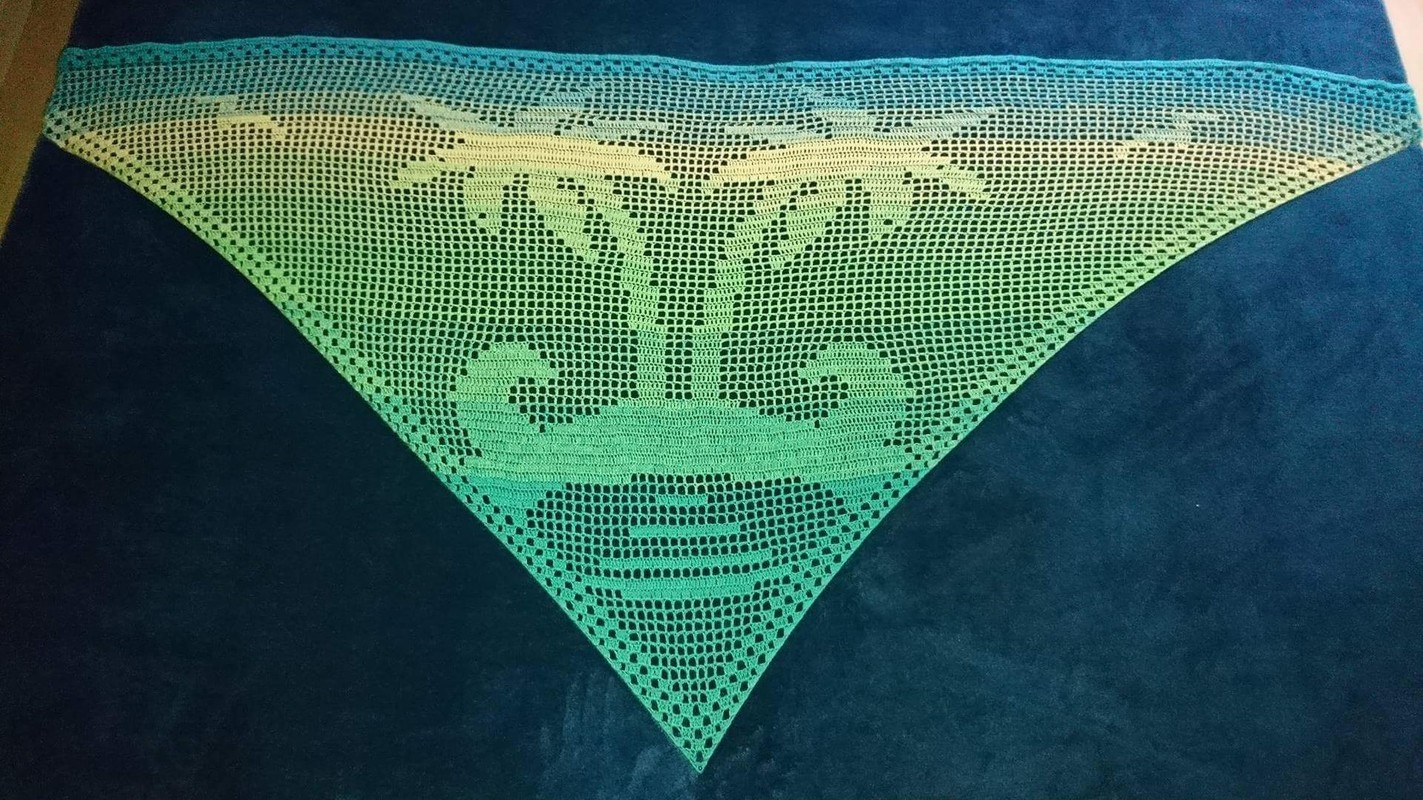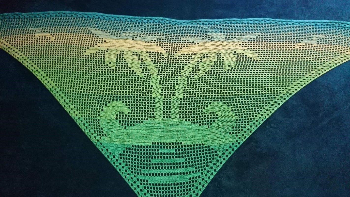 Das Motivtuch wurde mit einem 3 fädigen Farbverlaufsgarn gehäkelt. Verwendet wurden ca. 900 Meter. Damit hat das Tuch eine Größe von etwa 210x90 cm.