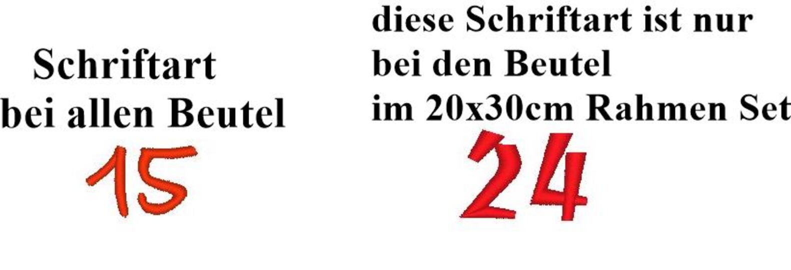 Die Beispiele vom Foto sind die Dateien vom 20x30 cm Rahmen die einzelnen Beutel haben eine andere Schriftart