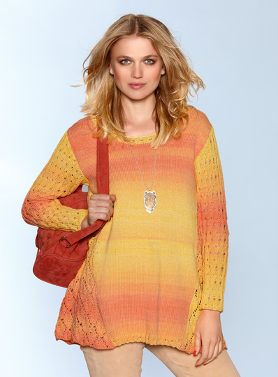 Junghans-Wolle "Pinta" (100% Baumwolle, LL ca 120 m/50 g): 550 (600) g Mango Fb 109-087; addi-Stricknd 3,5 mm und 4 mm; addi-Rundstricknd 3,5 mm, 40 cm lang.