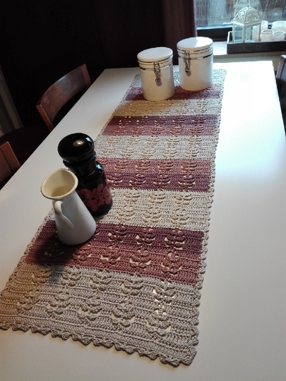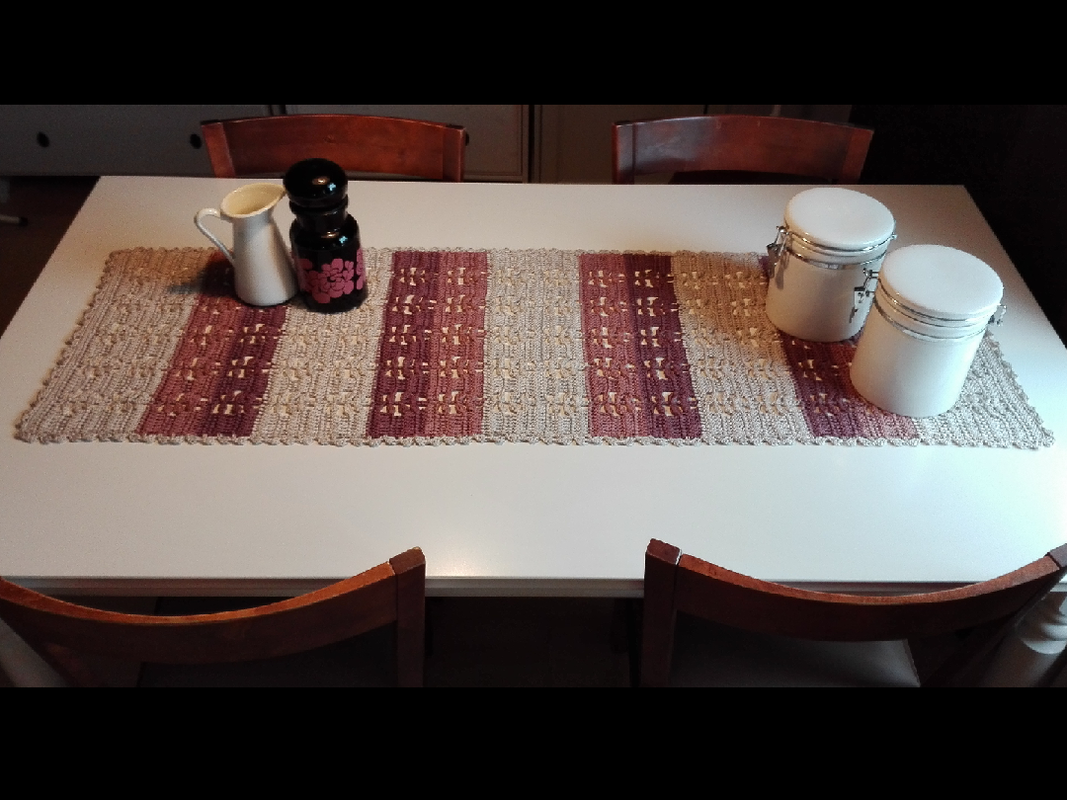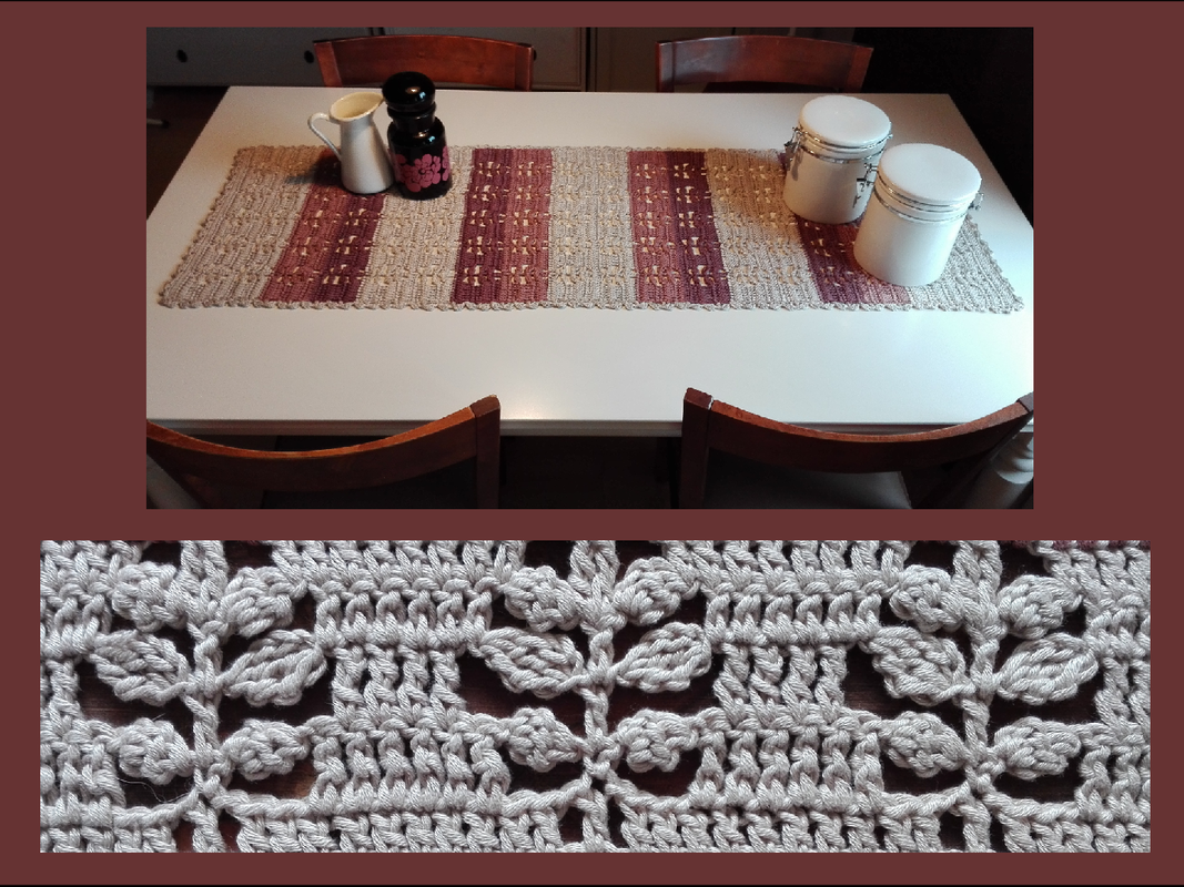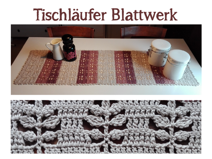 Der 3-farbige herbstliche Läufer besteht aus einem Blätter-Musterblock, der sich stets wiederholt. In der Umrandung finden sich dann dieselben Blatt-Elemente, die im Muster verwendet wurden, wieder. Du kannst die Größe des Tischläufers wie es Dir beliebt, anpassen – die Maschenzahlen dafür sind in der Anleitung angegeben. Außerdem gibt es einige Vorschläge für weitere Varianten der Länge des Läufers und der Musterblock-Farb-Reihenfolge / -Kombination.
