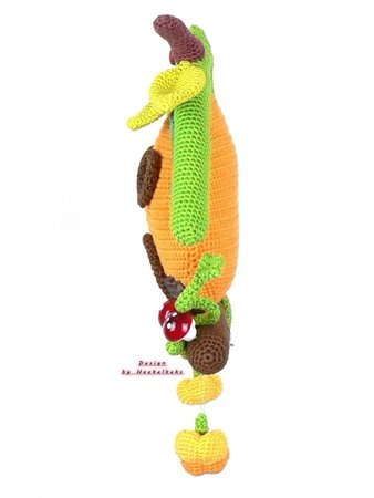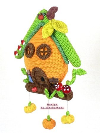 Die endgültige Größe ist je nach Garn, Nadelstärke und Häkelfestigkeit verschieden. Das Kürbishaus (ohne die hängenden Kürbisse) wird ca. 23cm hoch und ca. 22cm breit.