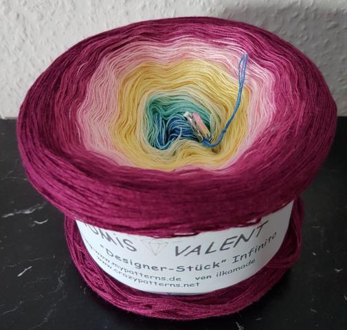 Das von mir verwendete Farbverlaufsgarn kommt aus dem Hause Nomis-Valent und hat den gleichnamigen Namen Infinito, da das Garn nach meinen Wünschen gewickelt wurde.