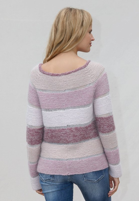 Lana Grossa "Cool Wool Alpaca" (70% Schurwolle, 30% Alpaka, LL ca 140 m/50 g): ca 100 (100-150-150) g Blassrosa Fb 20, ca 100 (150-150-150) g Flieder Fb 21, ca 100 (100-150-150) g Beere Fb 25, ca 100 (150-150-150) g Puderrosa Fb 26 und Lana Grossa "Silkhair" (70% Mohair, 30% Seide, LL ca 210 m/25 g): ca 100 (125-125-125) g Natur Fb 58; Lana Grossa-Rundstricknd 4 mm und 4,5 mm, 80 cm lang, Lana Grossa-Nadelspiel 4 mm und 4,5 mm; 4 Maschenmarkierer.