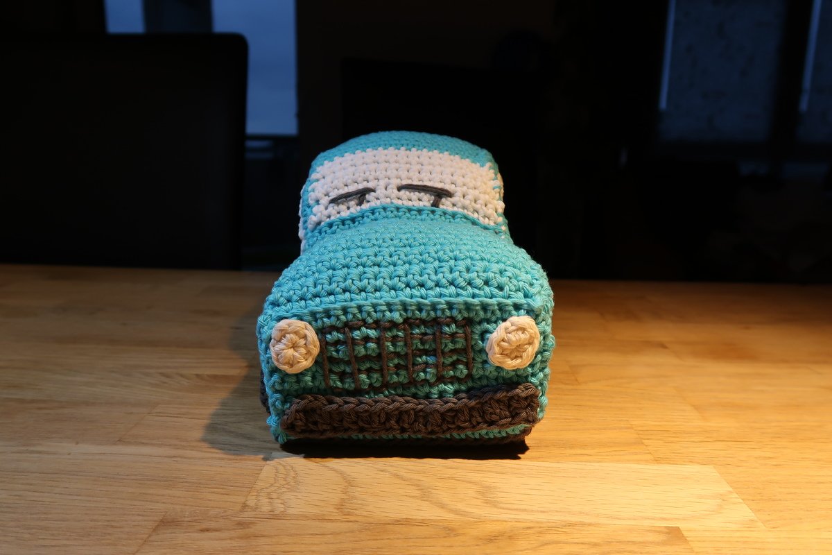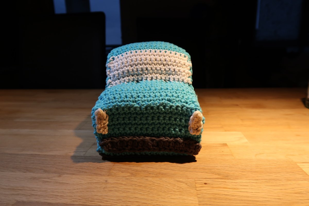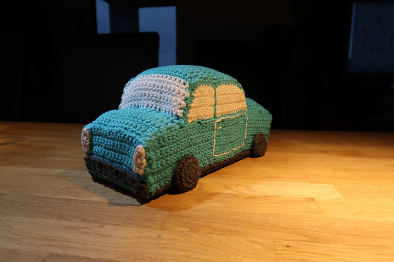 Mit der angegebenen Wolle wird der Trabi ca. 15 cm hoch, 13 cm tief und 30 cm breit.