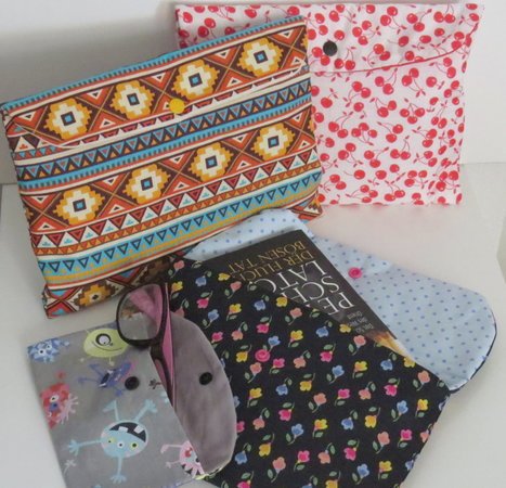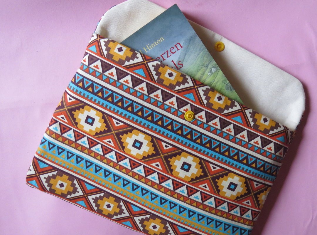 Die abgebildetete Tasche habe ich für ein Taschenbuch genäht, da ich gern ein Buch einstecke. So ist es gut geschützt, wird nicht schmutzig und bekommt keine umgeknickten Ecken.