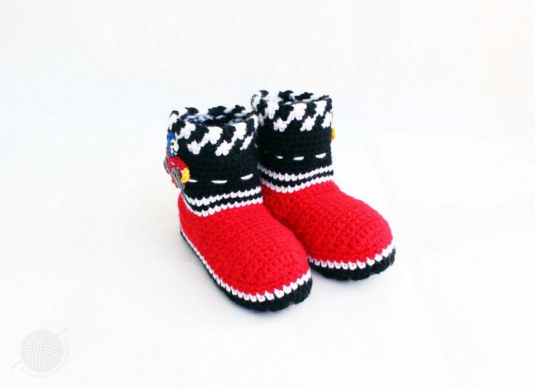 Die PDF-Häkelanleitung besteht aus bebilderter Anleitung zum Häkeln von Hüttenschuhe mit Filzsohle. Die Hüttenschuhe werden mit Applikation "Rennfahrer" dekoriert. Hüttenschuhe sind eine perfekte Alternative zu Hausschuhe. Die sind sehr weich und daher sehr bequem für die Kinderfüße.