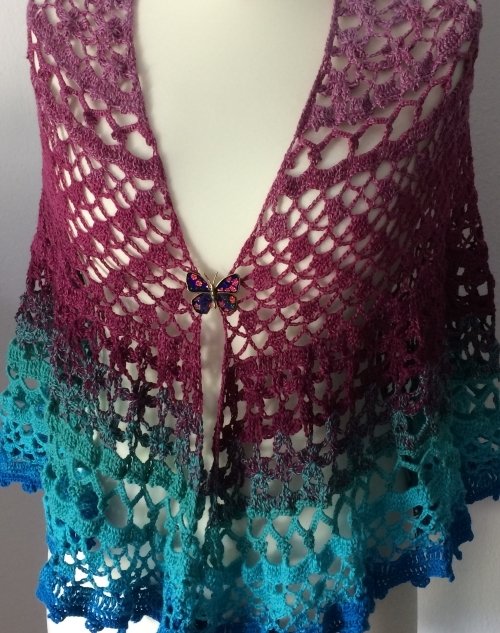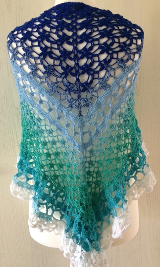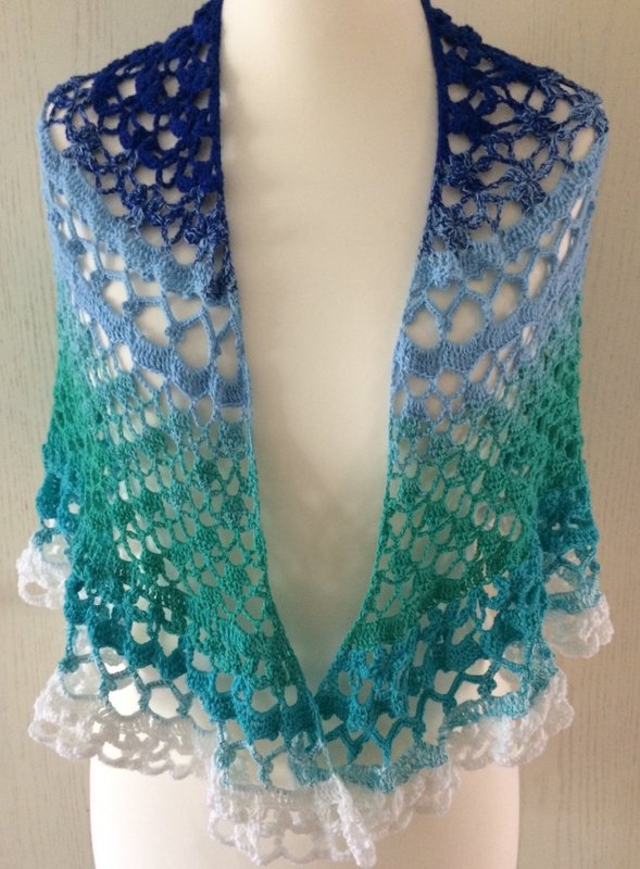 Mit 1000 Meter 3-fädigem Farbverlaufsgarn gefertigt misst das Tuch 150 cm an der langen Seite - mit 1250 Meter ingesamt 165 cm.