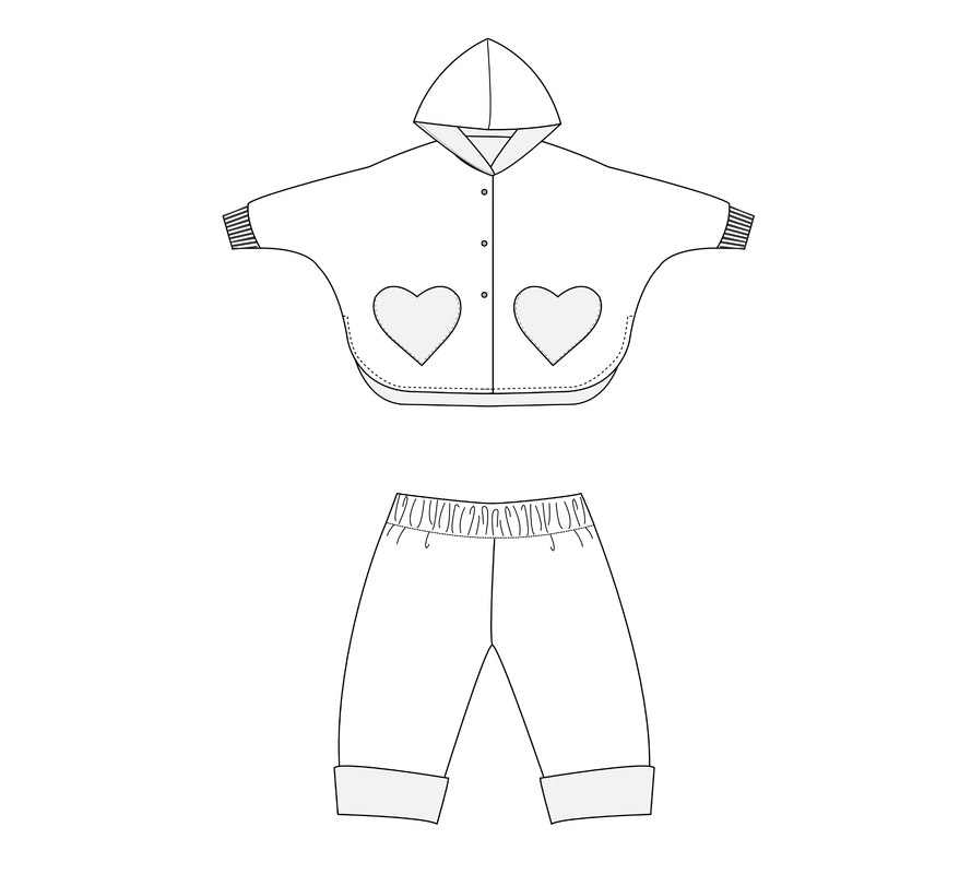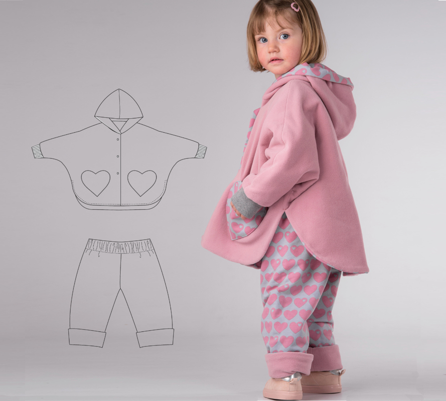 Mit diesem digitalen Kombi-Set nähst du zwei Lieblingsstücke für Babys und Kinder: den warmen Wende-Poncho MARA mit Kapuze sowie die bequeme Wendehose FIOCCO mit Gummibund. Beide Teile sind gefüttert und beidseitig tragbar – ideal für Frühling, Herbst und Winter. Der Poncho lässt sich dank Druckknöpfen einfach an- und ausziehen; bei MARA stehen zwei Taschenvarianten zur Wahl.