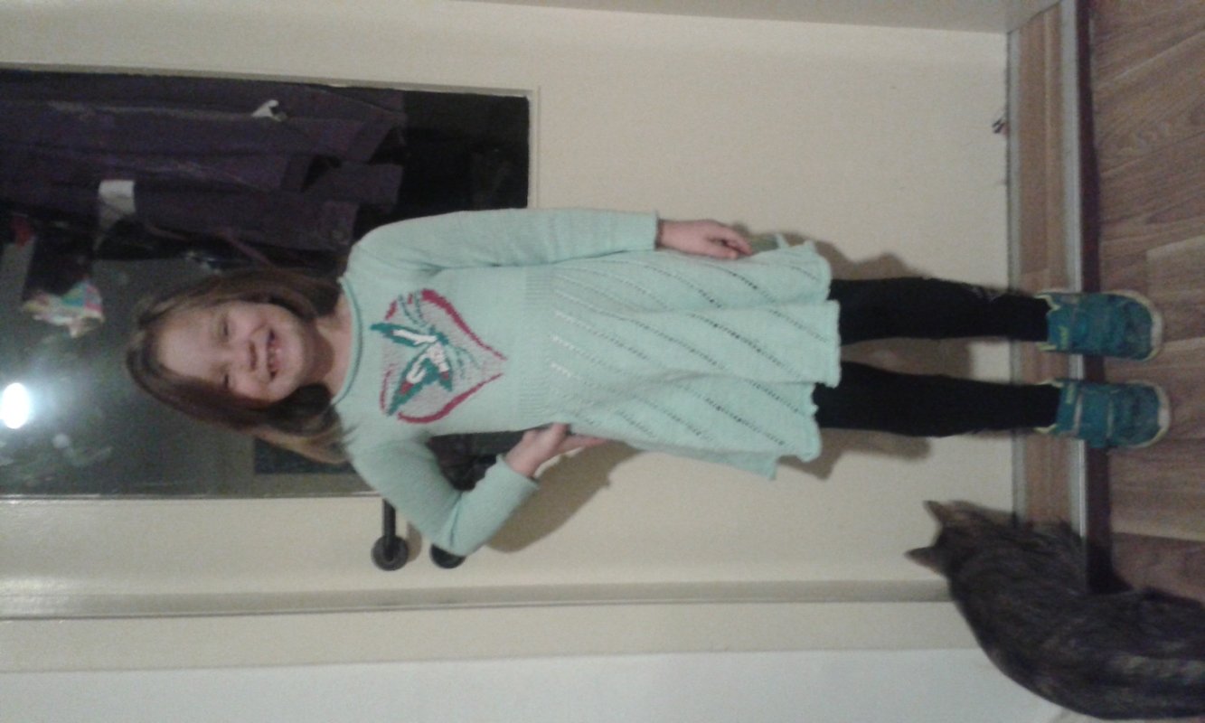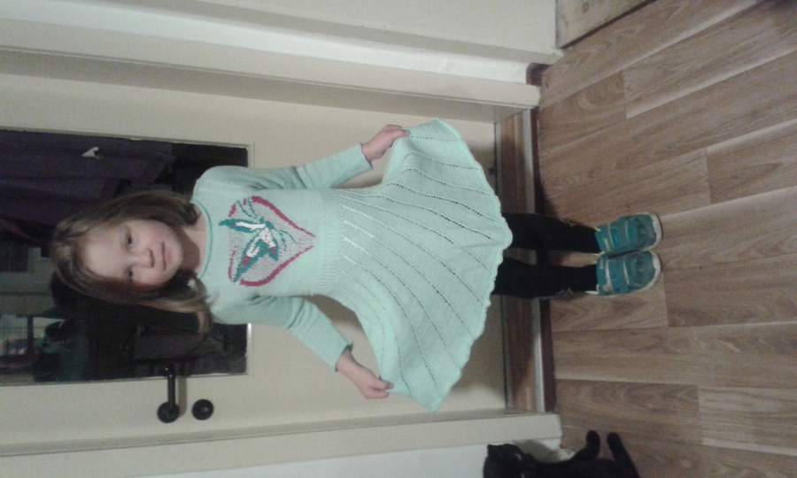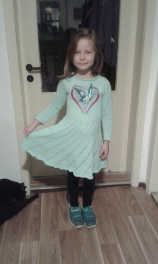 Die Angaben sind für Größe 122/128. Größenanpassungen lassen sich jedoch leicht durch einen höheren M-Anschl (MS=20M) für Rocklänge + OT-Weite vornehmen. Für eine Längenzunahme des OT einfach beim Übergang vom Rock zum OT die benötigte Anz R gl re einfügen. Ärmel z.B. durch einige R Bundmuster statt der 2 R gl li nach dem Anschl. auf das gewünschte Maß verlängern. Oder einfach etwas stärkeres Garn und entsprechend dickere Nadeln verwenden, ich enpfehle dazu allerdings, zuvor eine Maschenprobe zu arbeiten.