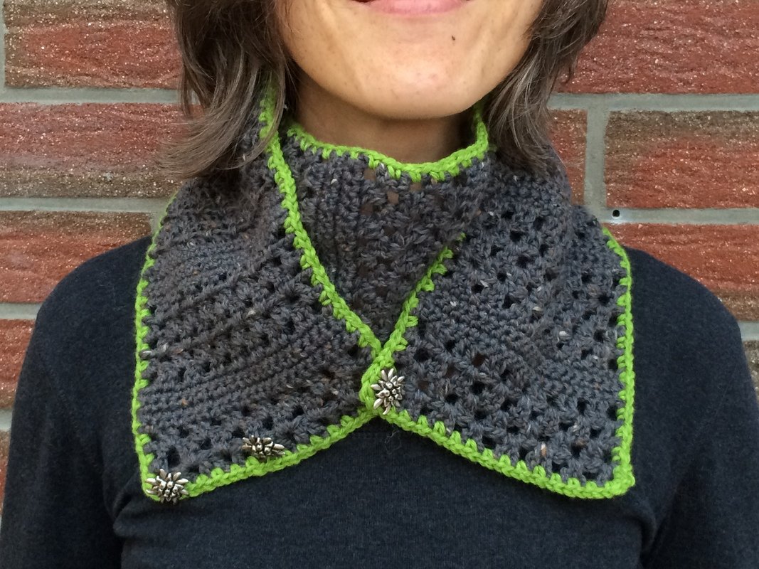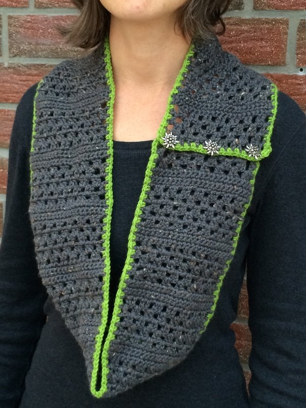 Schmückt nicht nur Dirndl und Lederhose! Dieser ganz besondere Loop / Schal aus rustikalen Häkelmaschen, in edlem graphitgrau mit frischem apfelgün kombiniert, passt auch ganz hervorragend zum aktuellen Jeanslook.
