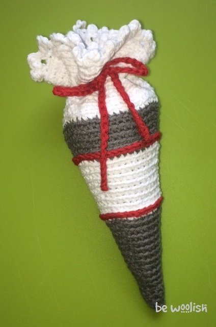 Gehäkelt ist sie mit einer NS 3,5 und einem Garn mit 112m Lauflänge auf 50g (z.B. Woll Butt Schulgarn). Mit der angegebenen Wolle wird sie etwa 20 cm groß (Füllhöhe 15 cm). Die Größe kann individuell über die Wolle und Nadelstärke angepasst werden.