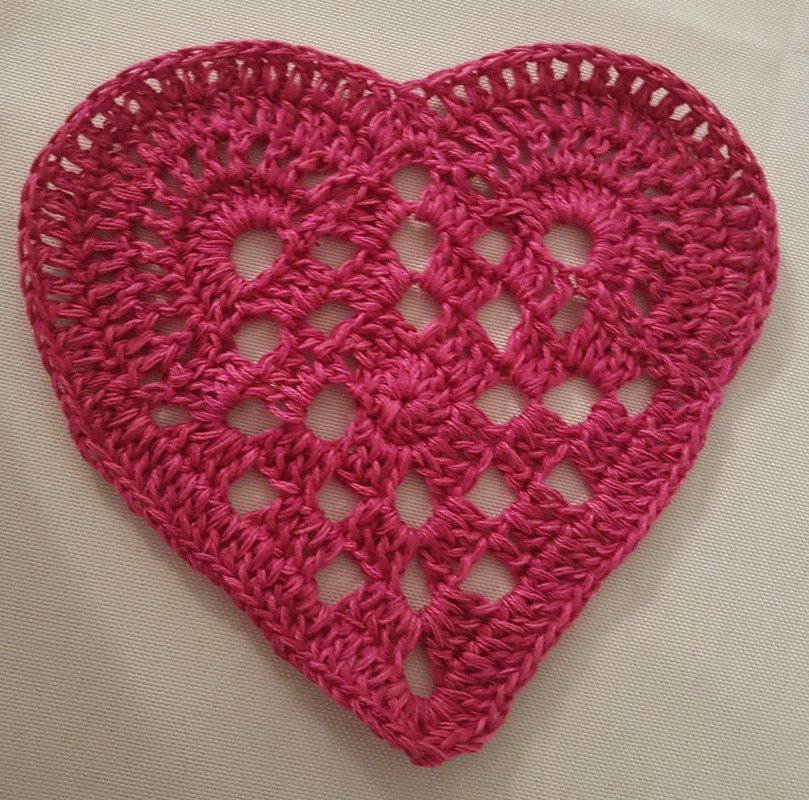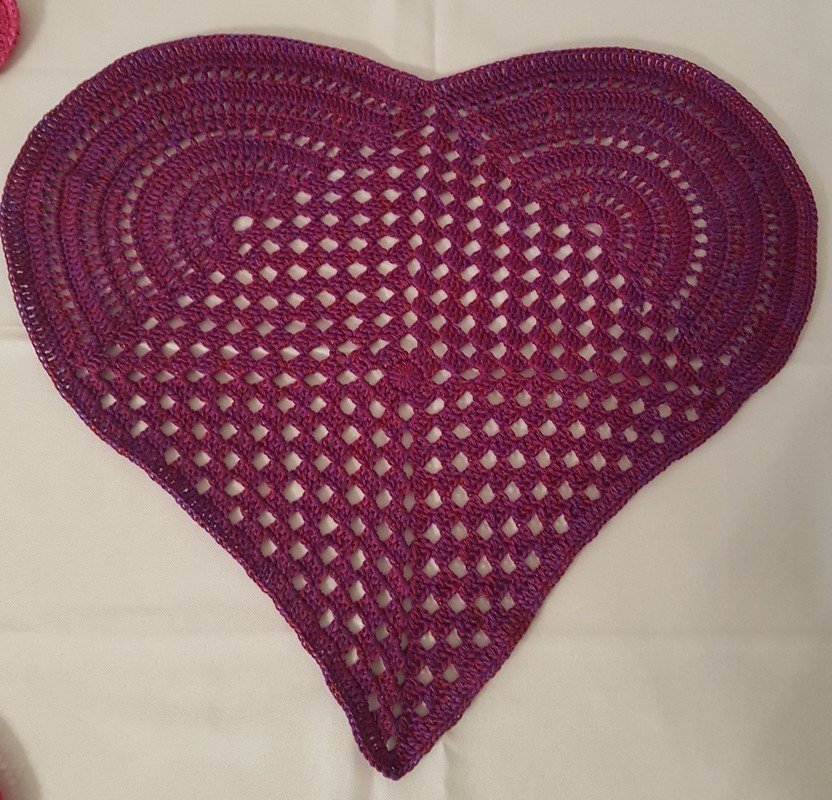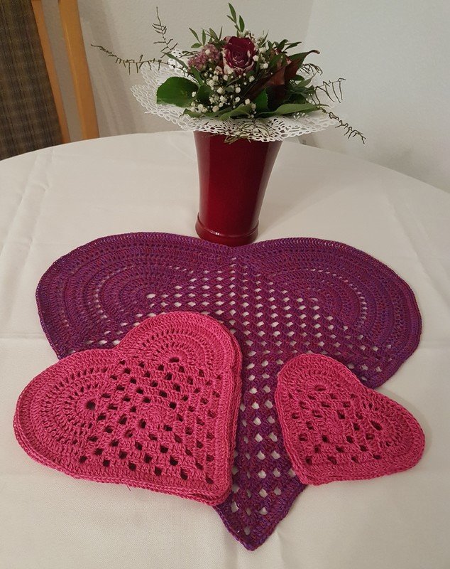 Genutzt wurde ein 4 fädiger Bobbel mit einer Lauflänge von 600 Meter und gehäkelt mit einer 3 er Häkelnadel (600 m ll = Gesamtverbrauch für 1 Großes Herz, 3 mittlere und 3 kleine).