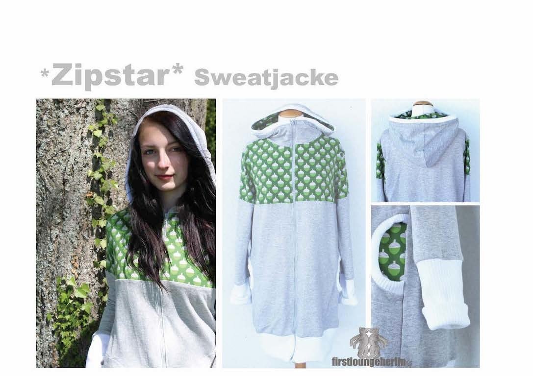 Zipstar Sweatjacke E-Book mit Schnittmuster und ausführlicher Nähanleitung auf Youtube Video - XS-XXXL in 7 Größen und 2 Längen - mit Spitz- oder Rundkapuze oder Kragen.