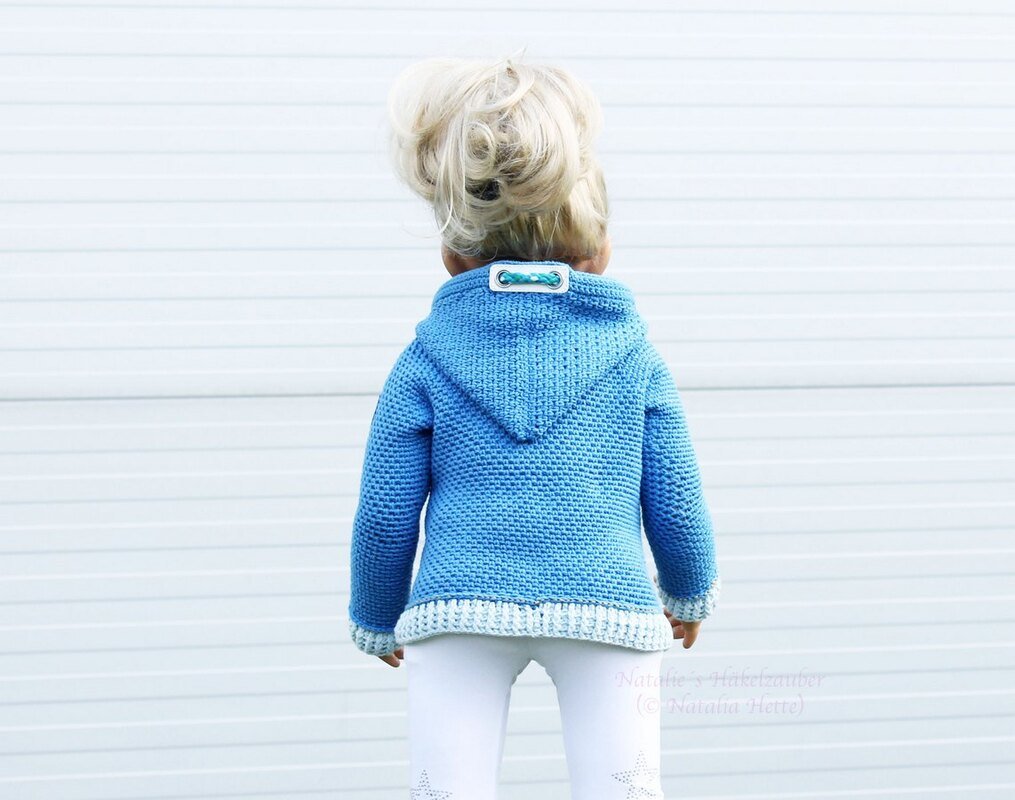 Wichtig! Machen Sie bitte keine Schnüre im Halsbereich bei den Kleinkindern, sondern häkeln Sie die Kapuze mit einigen Reihen fM um.