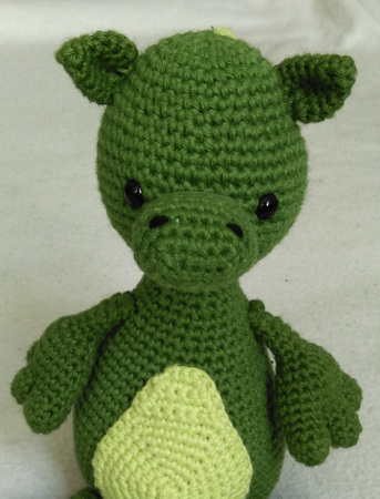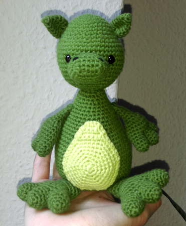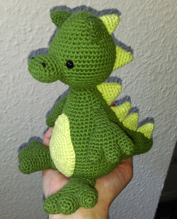 Der fertige Drache wird mit einem Garn für die Nadelstärke 3,0 ca. 16cm groß.