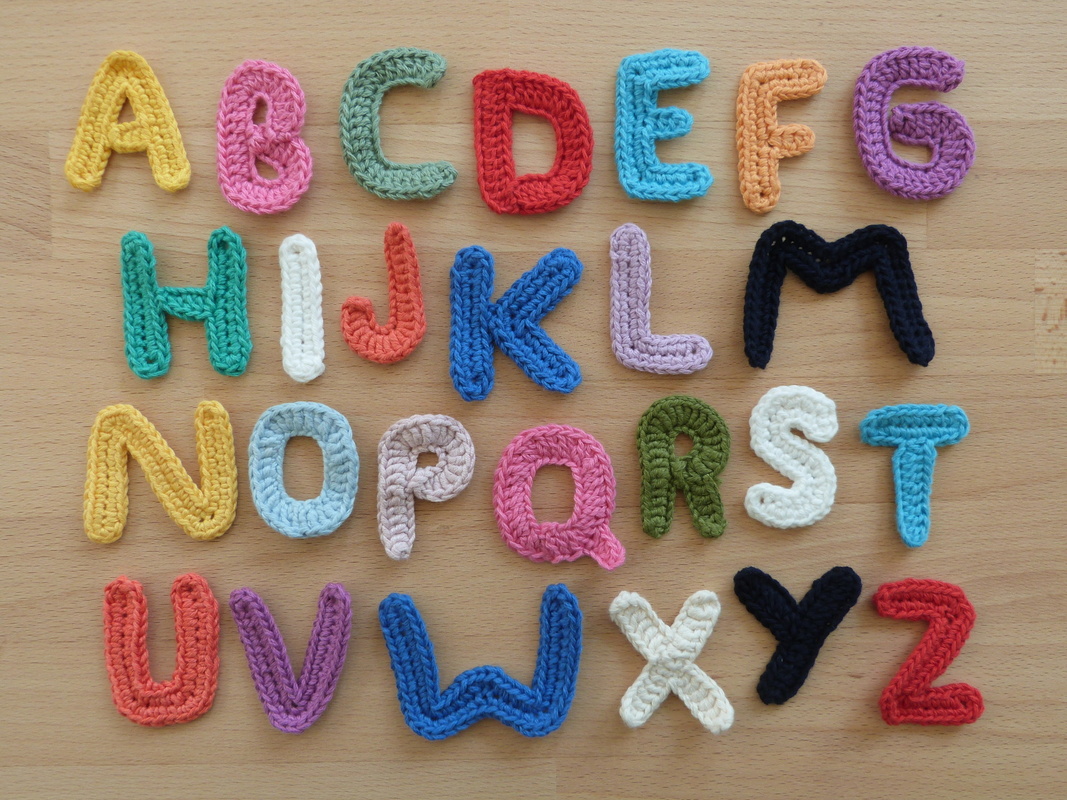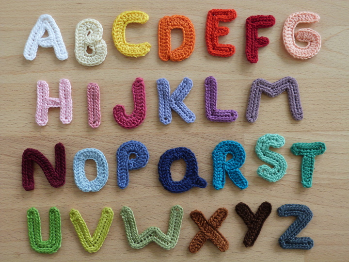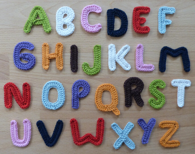 Häkelanleitung für Buchstaben-Applikationen zum Aufnähen oder Aufkleben.