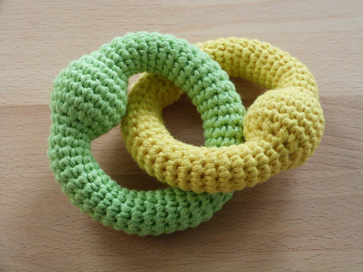 Bei Verwendung von Baumwollgarn mit einer Lauflänge von 90m/50g und Nadelstärke 3,5 wird jeder Ring ca. 9 cm groß. Zusätzlich benötigst du eine kleine Rasseldose und zur Fertigstellung eine Stopfnadel.