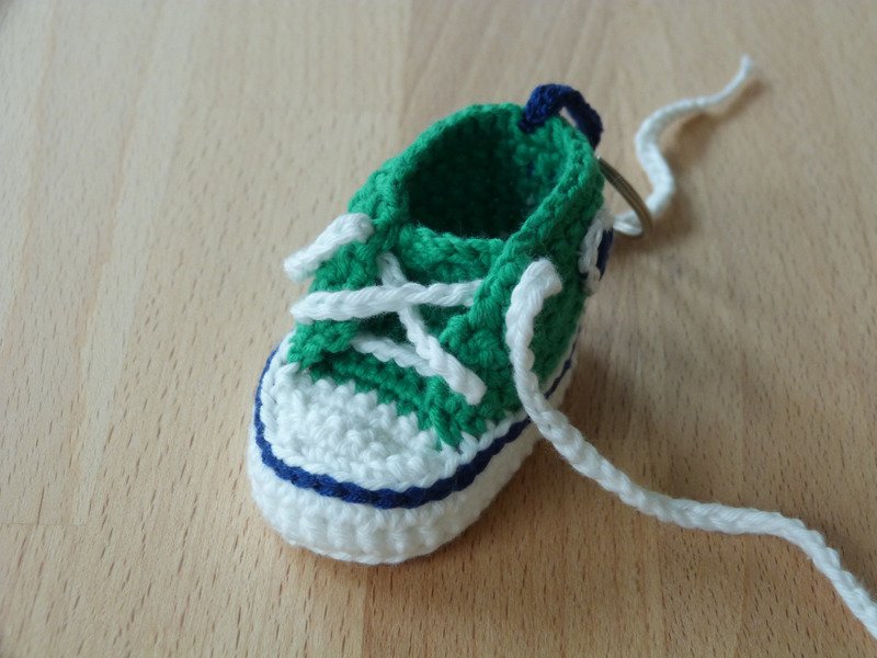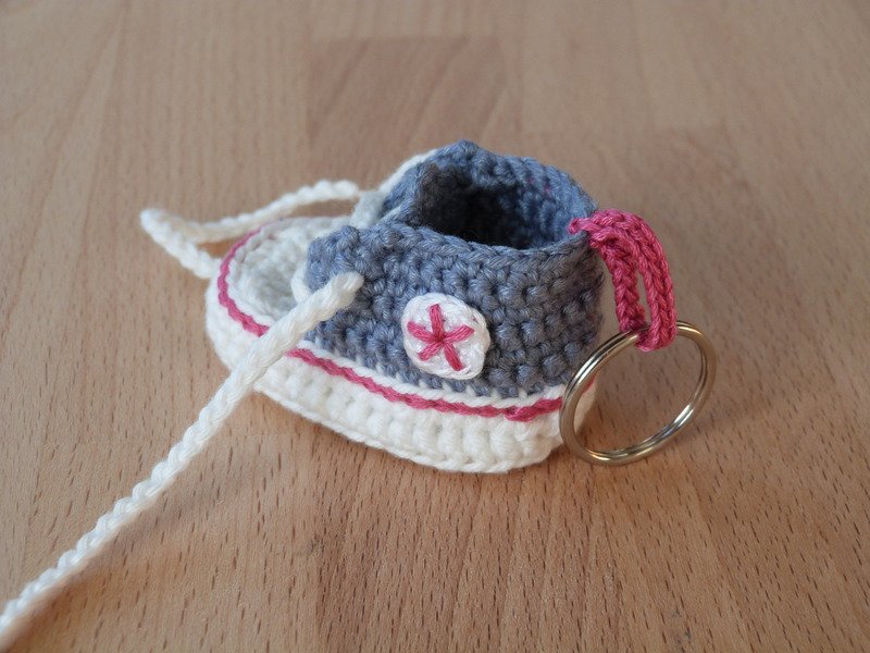 Bei Verwendung von Baumwollgarn mit einer Lauflänge von 125m/50g mit Nadelstärke 2,5 wird der Anhänger etwa 6,5 cm lang. Zur fertigstellung benötigst du noch eine Stopfnadel und einen Schlüsselring.