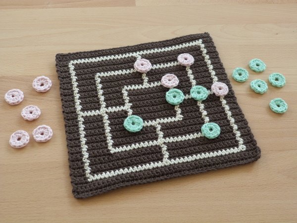 Bei Verwendung von Baumwollgarn mit einer Lauflänge von ca. 90m/50g und Nadelstärke 3 wird das Spielfeld etwa 20 x 20 cm groß und die Spielsteine haben einen Durchmesser von 2 cm.