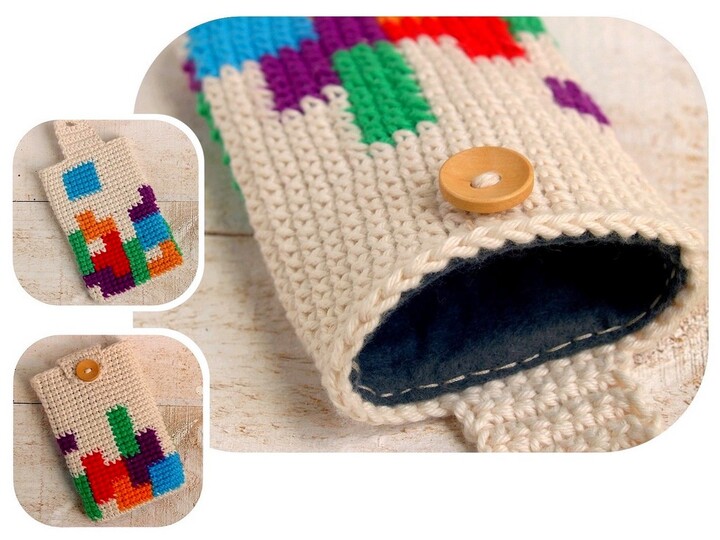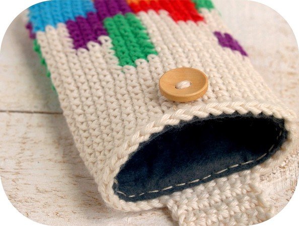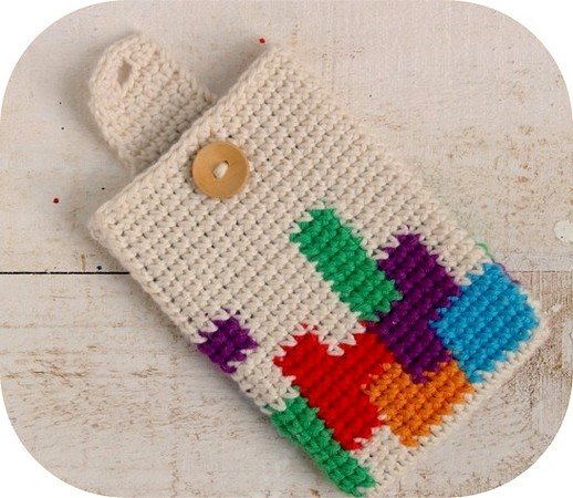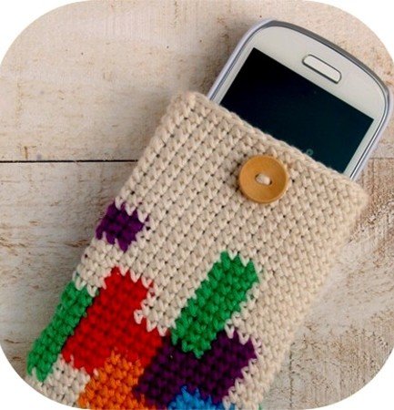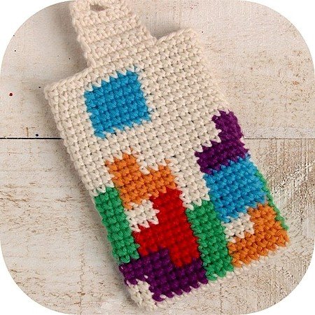 Smartphones als tägliches Gebrauchsgut benötigen nicht nur stabile, sondern auch schöne Taschen und Hüllen. Im Idealfall spiegeln diese Ihre Individualität, Persönlichkeit und Kreativität wider. Wie zum Beispiel diese gehäkelte Smartphonetasche mit einem bunten "Bausteinmuster" in blau, rot, violett, grün und gelb.