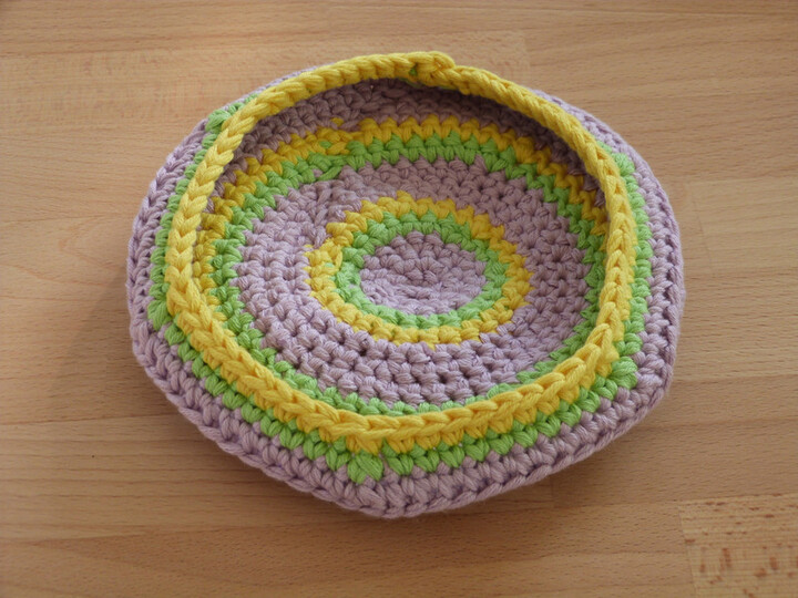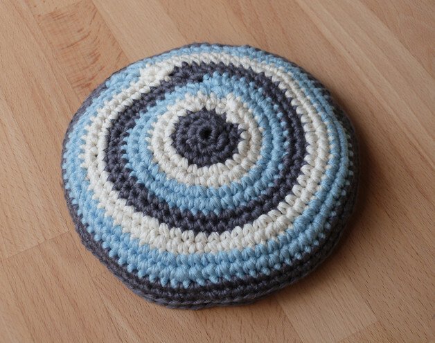 Häkelanleitung für eine Wurfscheibe in 3 Größen.