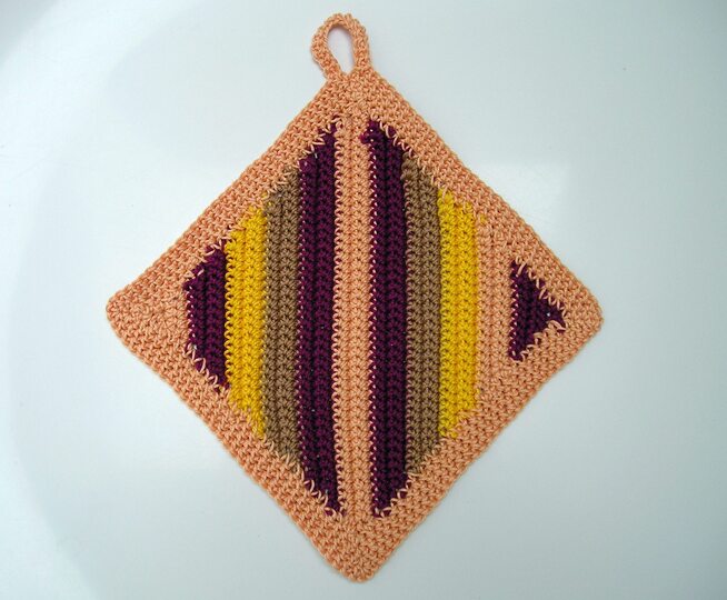 Der Motivtopflappen wird mehrfädig mit festen Maschen gehäkelt. Dabei hat man einen Arbeitsfaden und mehrere Ruhefäden. Während man mit dem Arbeitsfaden Maschen häkelt werden die Ruhefäden von den festen Maschen mit umhäkelt. Dadurch bilden die Ruhefäden auf den Rückseite keine langen Schlaufen und sind fast unsichtbar. Das ist nicht besonders schwierig und auch für Häkelanfängerinnen gut zu bewältigen. Die Anleitung enthält eine ausführliche textliche Beschreibung sowie eine Häkelschrift.