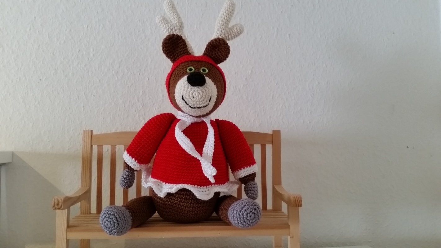 Raphaela Rentier wird, unter Verwendung des angegebenen Materials, sitzend 23 cm groß (ohne Geweih). Ich persönlich empfehle für das Nacharbeiten all meiner Kuscheltiere und Puppen Baumwollgarn.