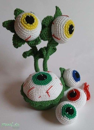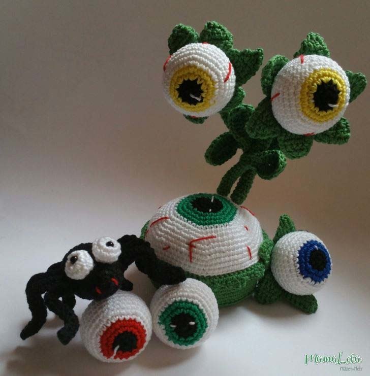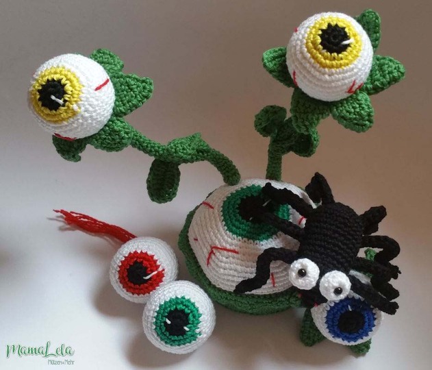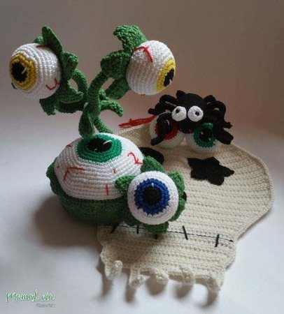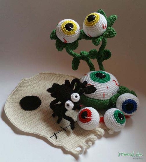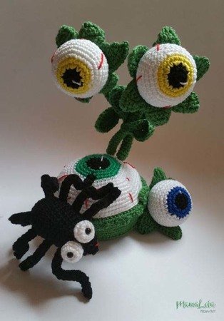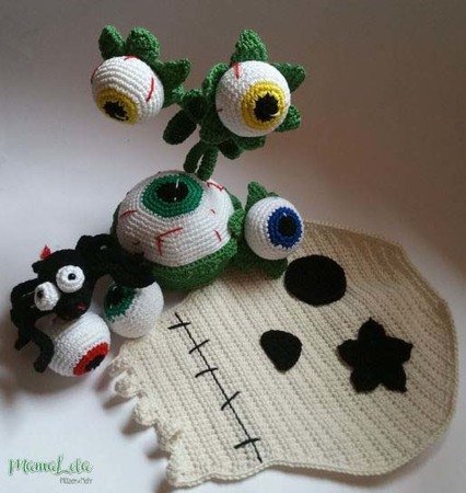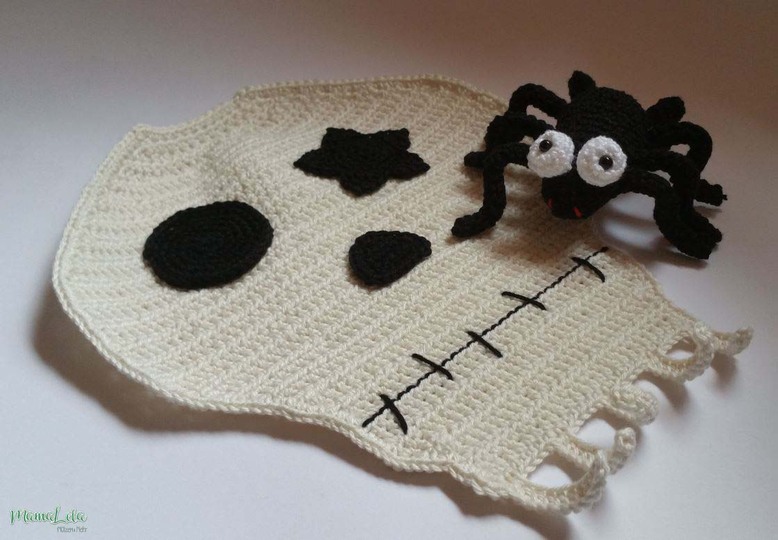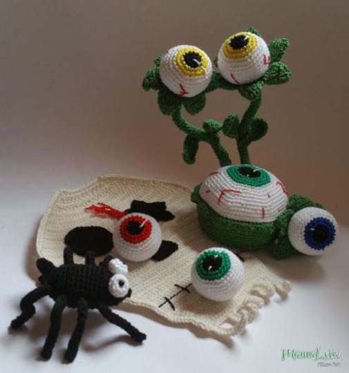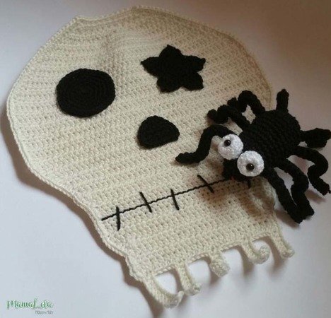Mit dieser Häkelanleitung könnt ihr euch die im Artikelbild gezeigte Halloweendekoration Glotzer, Spinne und Totenkopf zaubern.