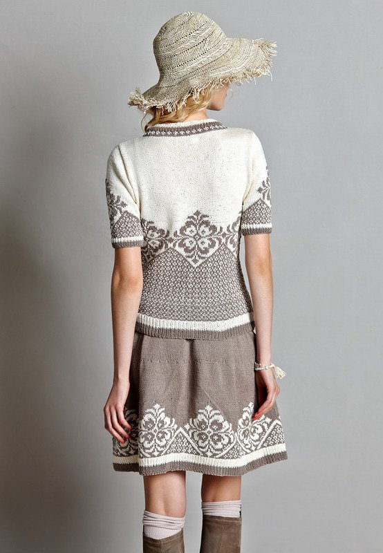 Lang Yarns "Quattro" (100% Baumwolle, LL ca 120 m/50 g): ca 450 (500-550) g Braun Fb 0139 und ca 300 (350-450) g Natur Fb 0094; für den Pulli: addi-Stricknd 3,5 mm, addi-Rundstricknd 3,5 mm, 40 cm lang; für den Rock: addi-Rundstricknd 3,5 mm, 120, 80 und 60 cm lang; ca 1,00 m Gummiband, 4 cm breit.