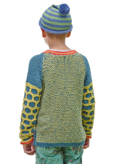 Pulli: Lana Grossa "Organico" (100% Baumwolle, LL ca 90 m/50 g): ca 200 (200-250-250) g Dunkelpetrol Fb 79, 150 (150-200-200) g Limette Fb 78 und 50 g Rot Fb 58; addi-Stricknd 5 mm, je eine addi-Rundstricknd 5 mm 40 und 60 cm lange; 6 Knöpfe von Union Knopf, Art 452 377, Fb Rot 18 mm Ø.