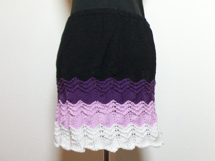 100% Baumwolle mercerisiert "Adina" von Rellana (50g weiß, 50g flieder, 50g pflaume, 150g schwarz; 125m Lauflänge auf 50g; diese Angaben sind für Gr. 36/38, für weitere Größen wird entsprechend mehr Garn benötigt), Stricknadel 4,0mm, Wollnadel, Schere, Gummiband, Nähnadel/Nähgarn (wie das Gummiband eingefasst wird, wird in Bild und Text Schritt für Schritt erklärt)