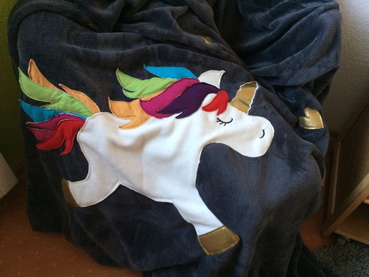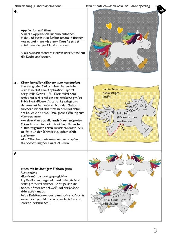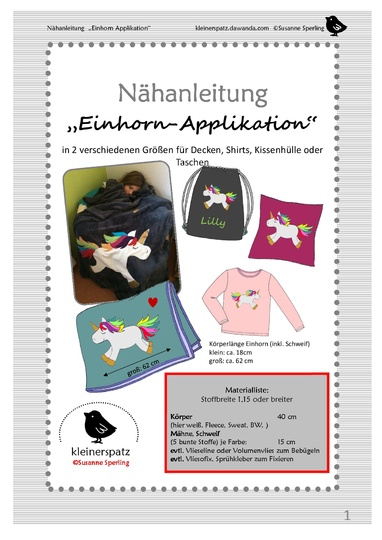 Mit dieser Anleitung und dem Schnittmuster kannst du dir eine tolle und kuschelige Decke mit einer riesigen Einhornapplikation nähen. Der bunte Schweif und die fliegende Mähne sind aus unterschiedlichen Stoffen gemixt, so dass hier wunderbar alle kleinen Reste von Jersey, Ringelbündchen oder andere bunten Stücke verarbeitet werden können. Die Einhornvorlage ist in Originalgröße angelegt und du kannst sofort mit dem Ausschneiden beginnen. Wir haben sie in zwei verschiedenen Größen gezeichnet, so dass du auch Sportbeutel, Shirts, Taschen oder Kissenhüllen damit aufpeppen kannst. Eine tolle Geschenkidee ist auch ein ausgestopftes Einhorn. In der Anleitung ist jeder Arbeitsschritt genau beschrieben und durch Zeichnungen leicht nachvollziehbar.