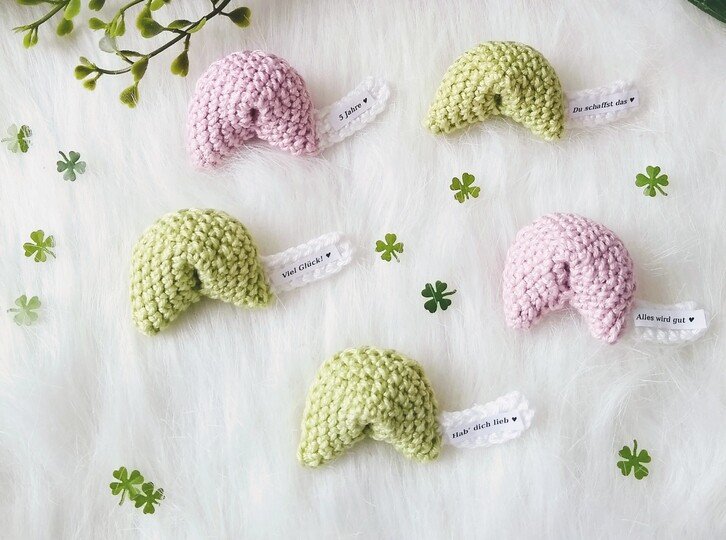Häkelanleitung für wunderschöne Glücks-Kekse gehäkelt aus festen Maschen.