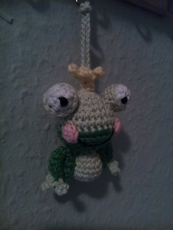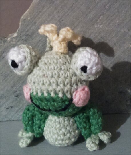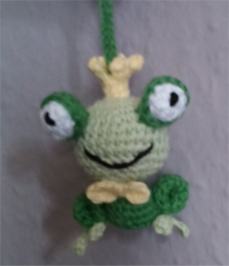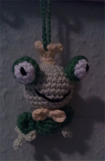 Bebilderte Anleitung zum Häkeln eines Froschkönigs Schlüsselanhängers.