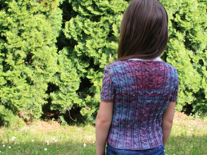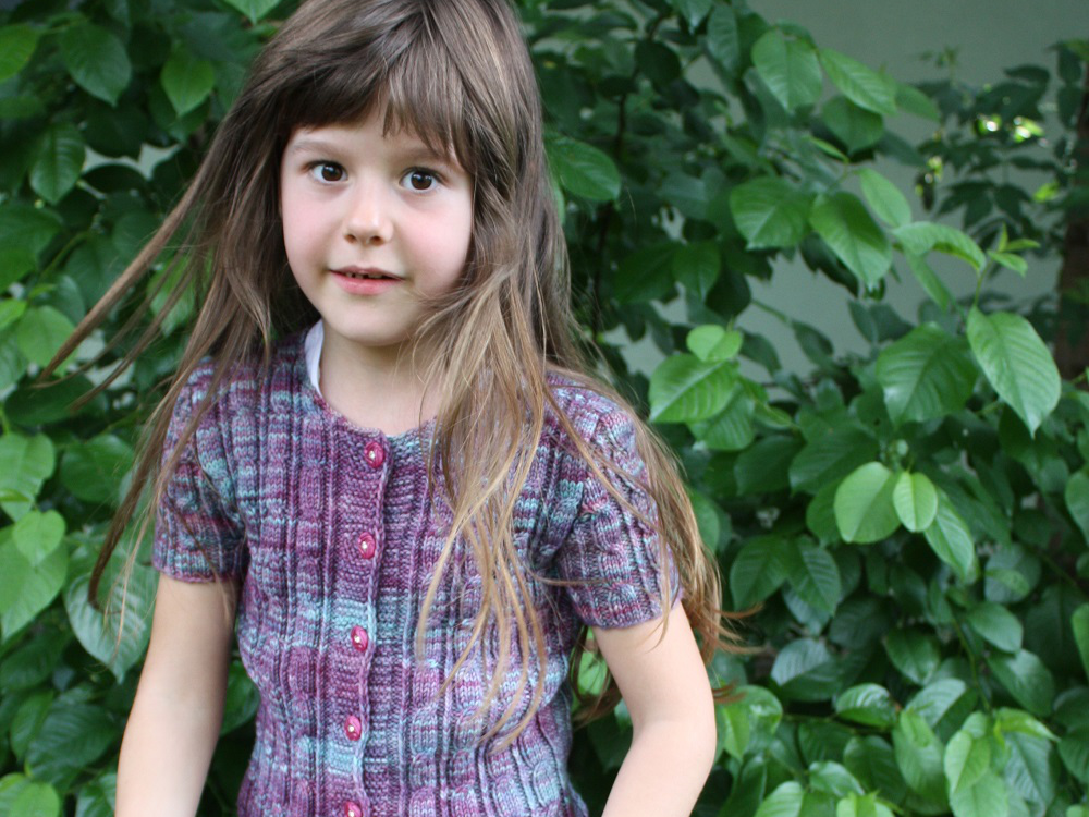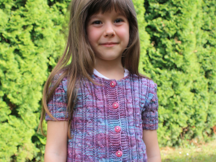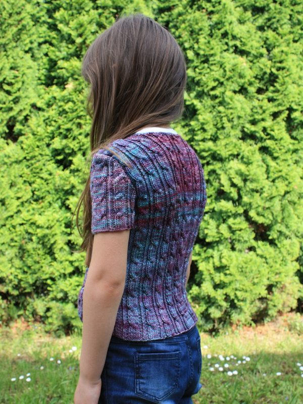 Jophiel ist eine kurzärmelige, sehr schmal geschnittene kurze Strickjacke mit rechts- und linksgedrehten Zopfmustern ringsherum.