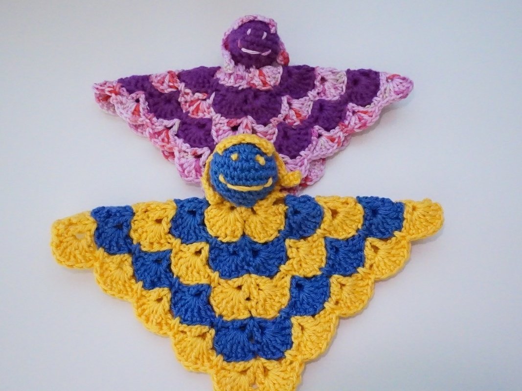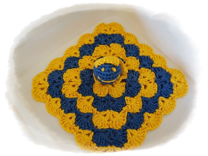 Das Kuscheltuch hat eine Seitenlänge von 13-14cm. Es macht sich gut auf den ersten Babyfotos.