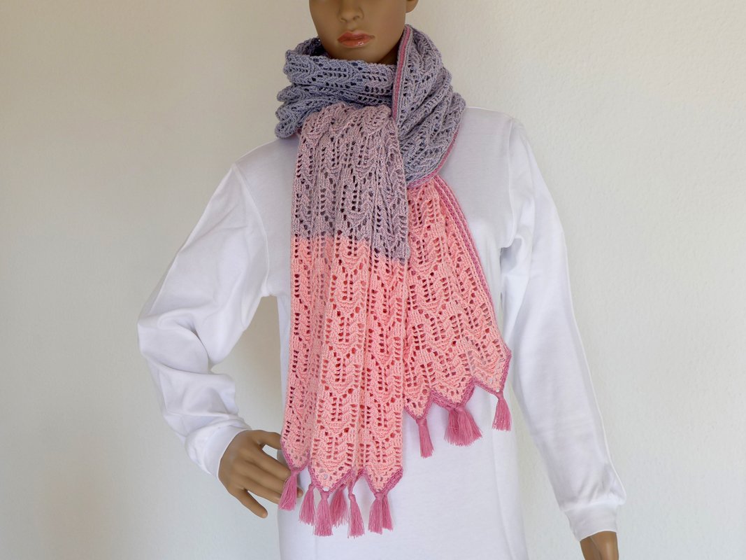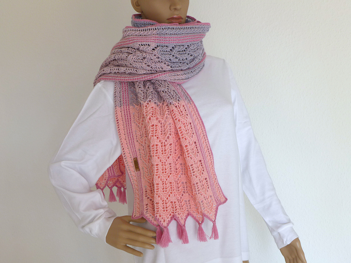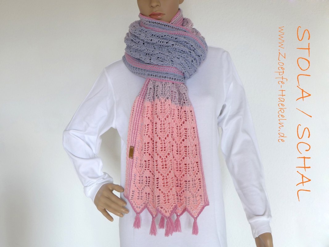 Die Stola kann beliebig in der Breite und Länge den eigenen Wünschen angepasst werden und sich somit zu einem Schal oder Loop verwandeln. In der Anleitung sind einige Beispiele mit Materialangaben aufgeführt.