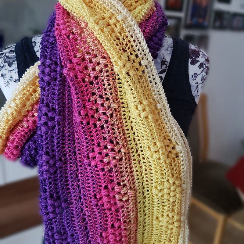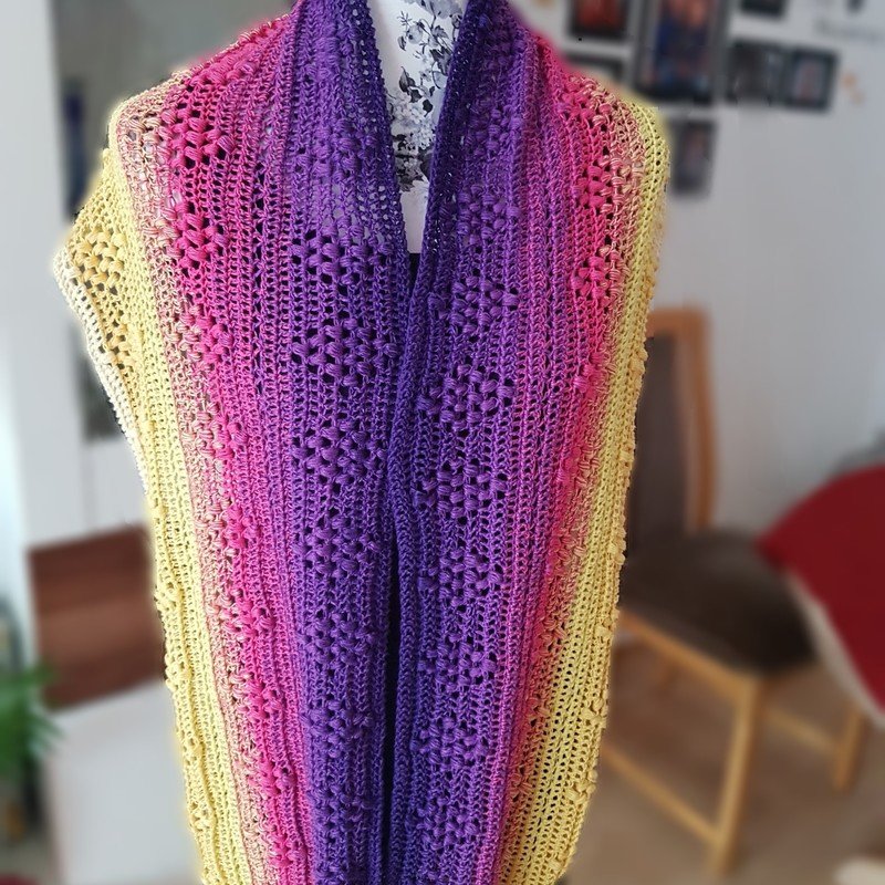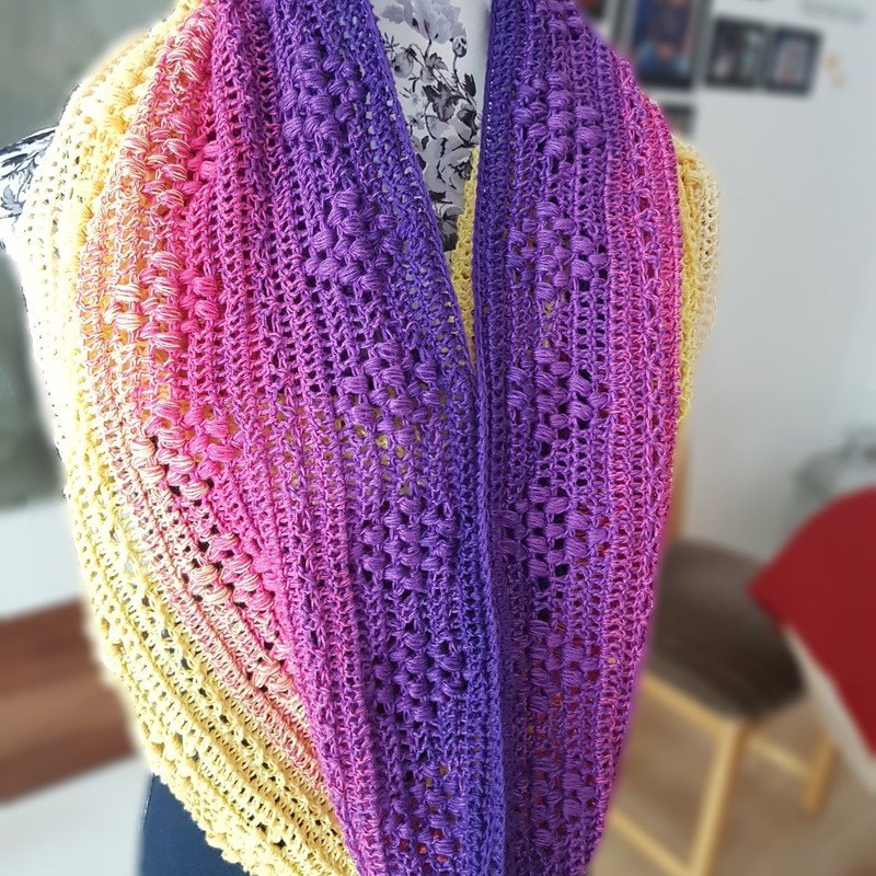 Der Loop besteht aus folgenden Maschen: Luftmaschen, Kettmaschen, Stäbchen und Noppen.