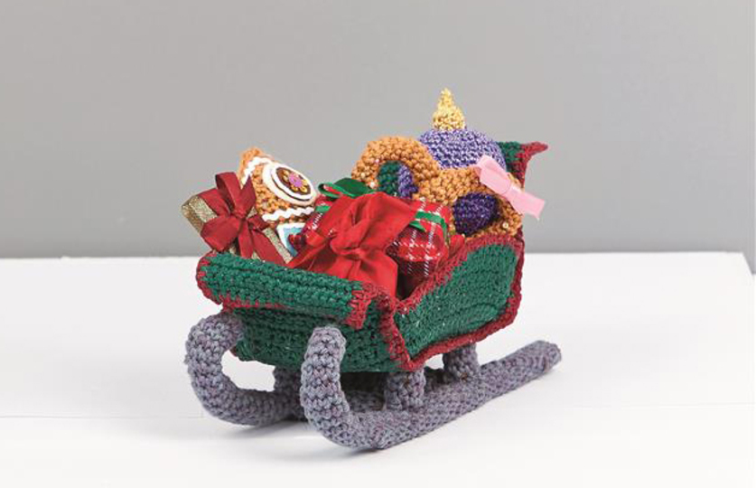 Häkel die perfekte Dekoration, die auch Kinder mögen werden: einen Weihnachtsschlitten, in den man kleine Süßigkeiten legen kann.