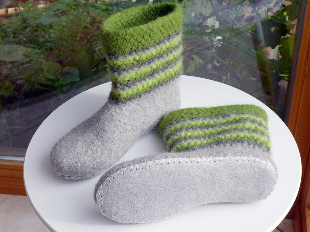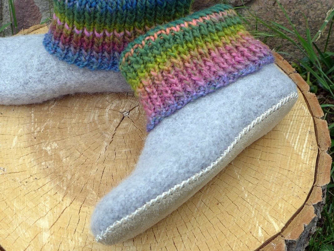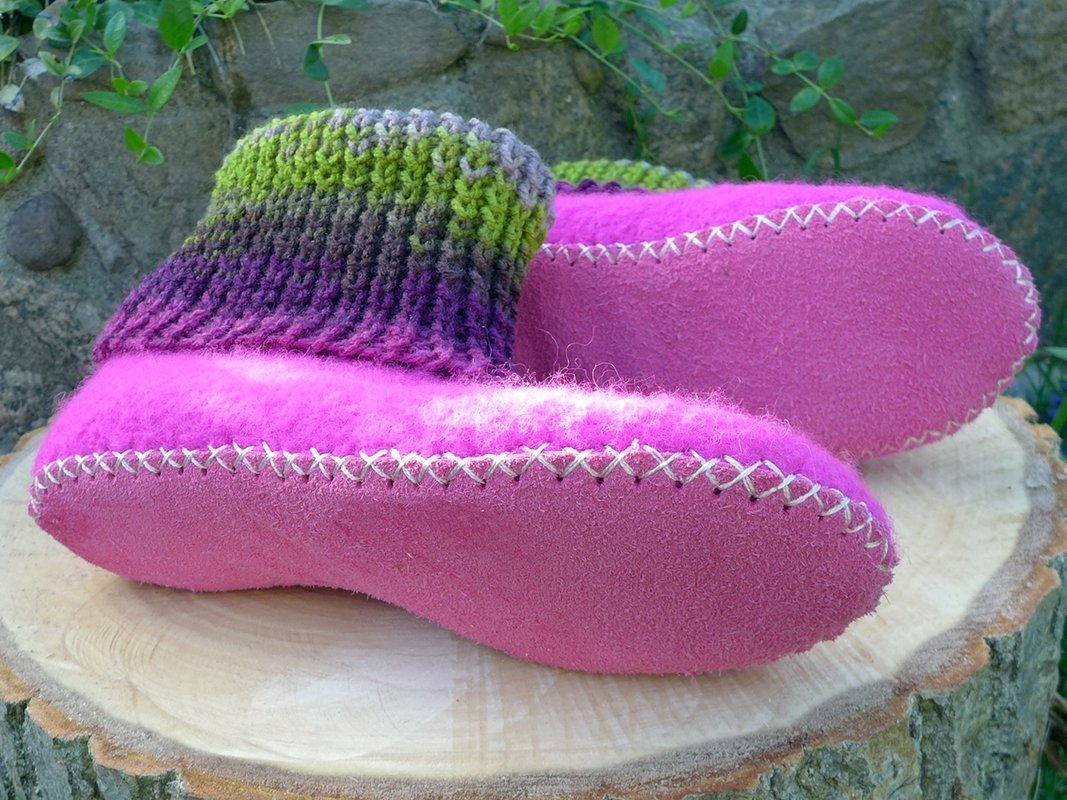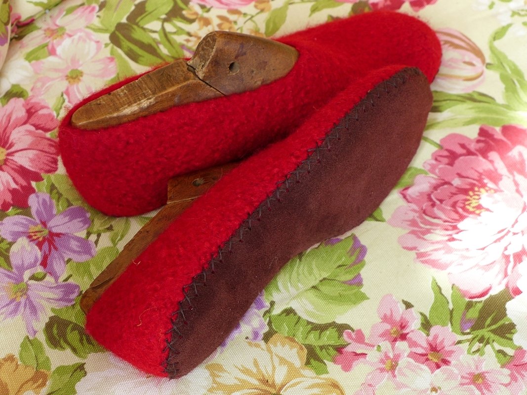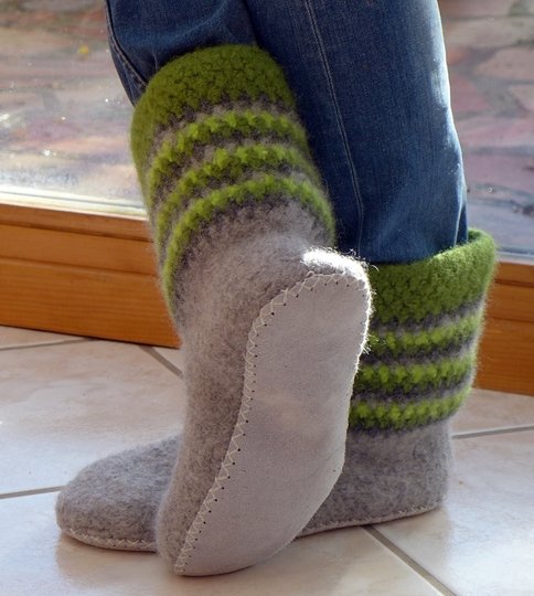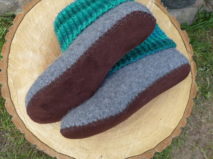 Filzschuhe müssen rutschsicher sein. Das ginge mit SockStop oder Flüssiglatex, aber es geht auch schöner, eleganter und haltbarer mit selbst gemachten Ledersohlen, die unter die Filzschuhe genäht werden. So halten die Schuhe viermal länger, der Auftritt wird noch mehr gedämpft und auch der Fußboden wird geschützt.