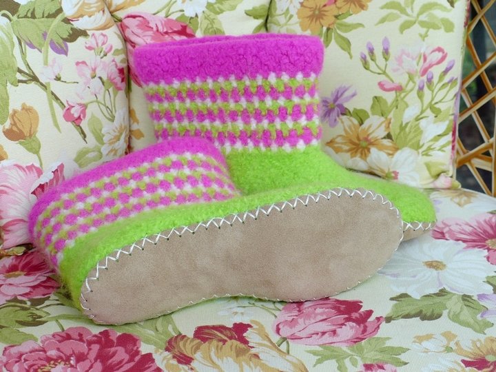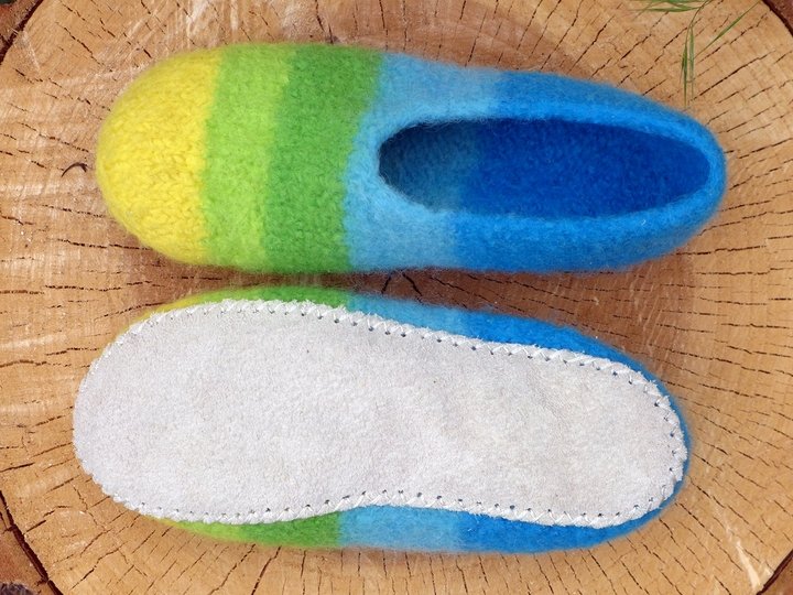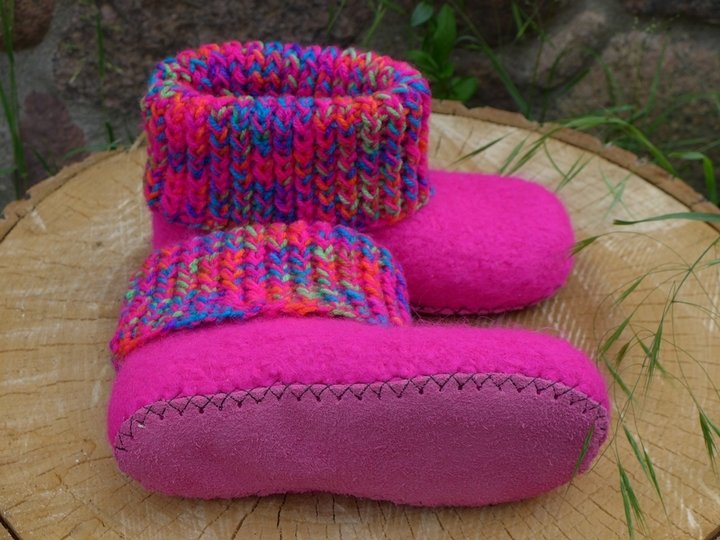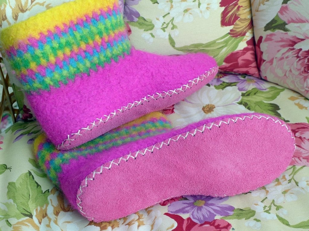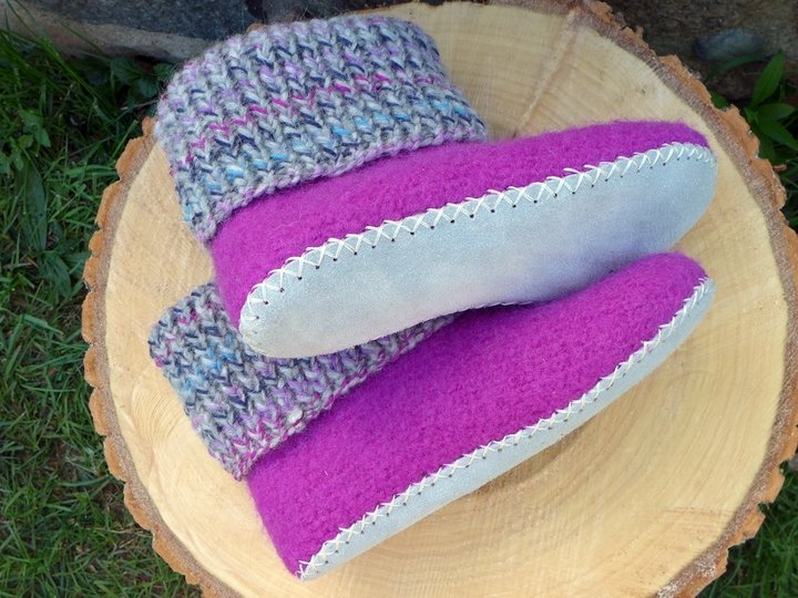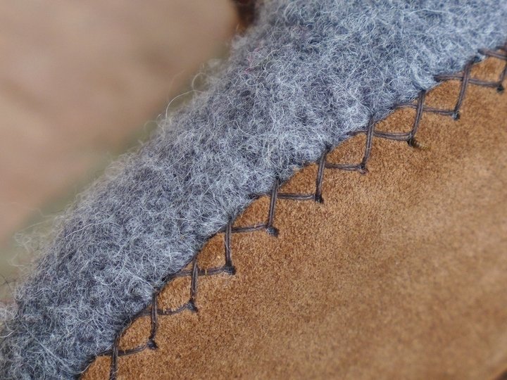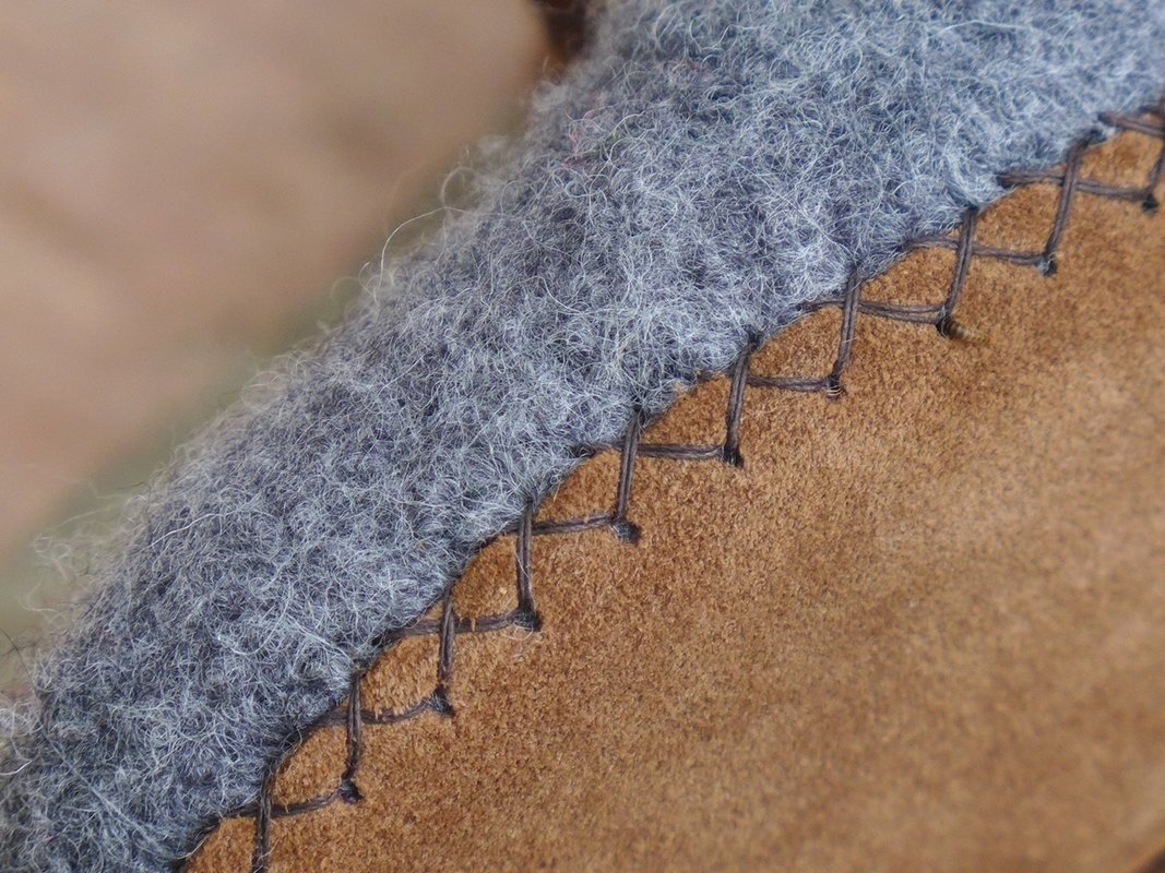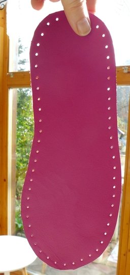 Filzschuhe müssen rutschsicher sein. Das ginge mit SockStop oder Flüssiglatex, aber es geht auch schöner, eleganter und haltbarer mit selbst gemachten Ledersohlen, die unter die Filzschuhe genäht werden. So halten die Schuhe viermal länger, der Auftritt wird noch mehr gedämpft und auch der Fußboden wird geschützt.