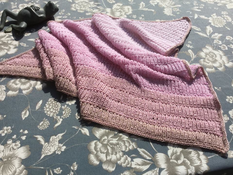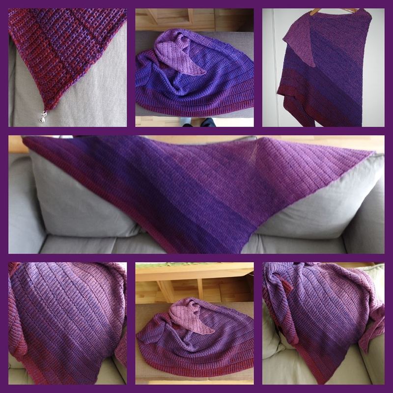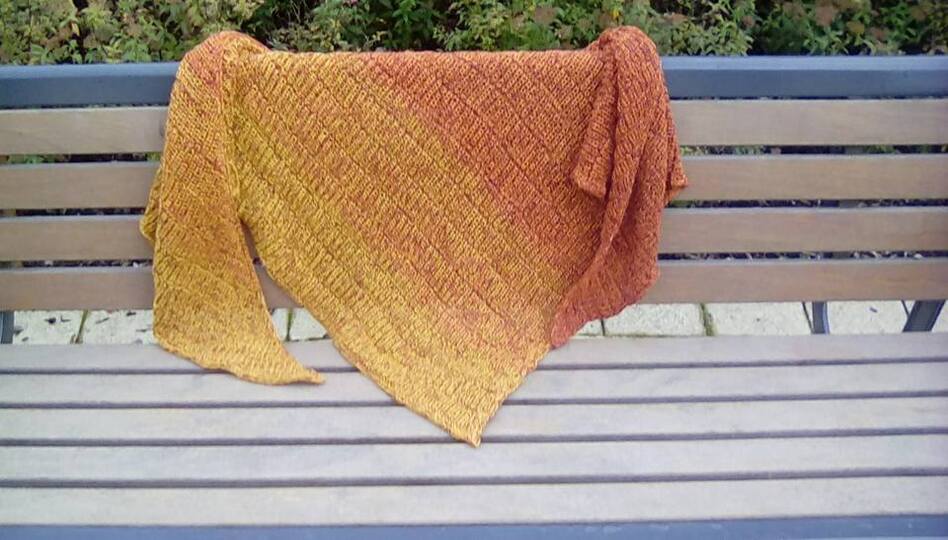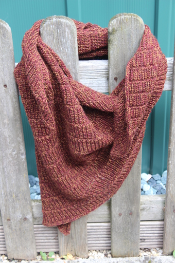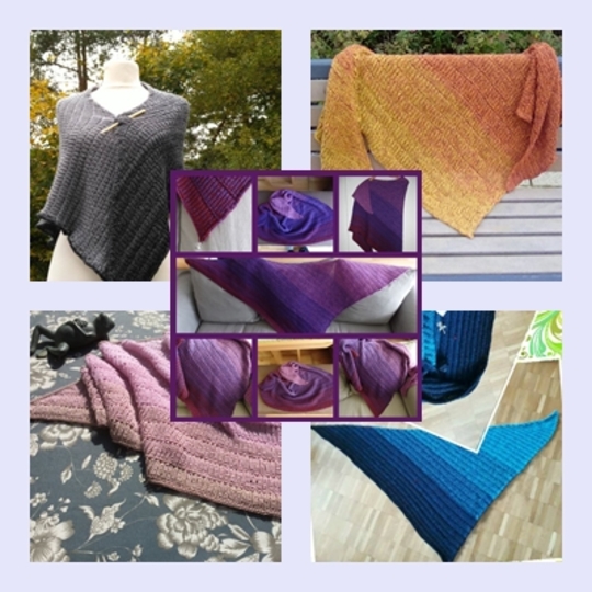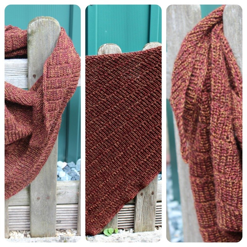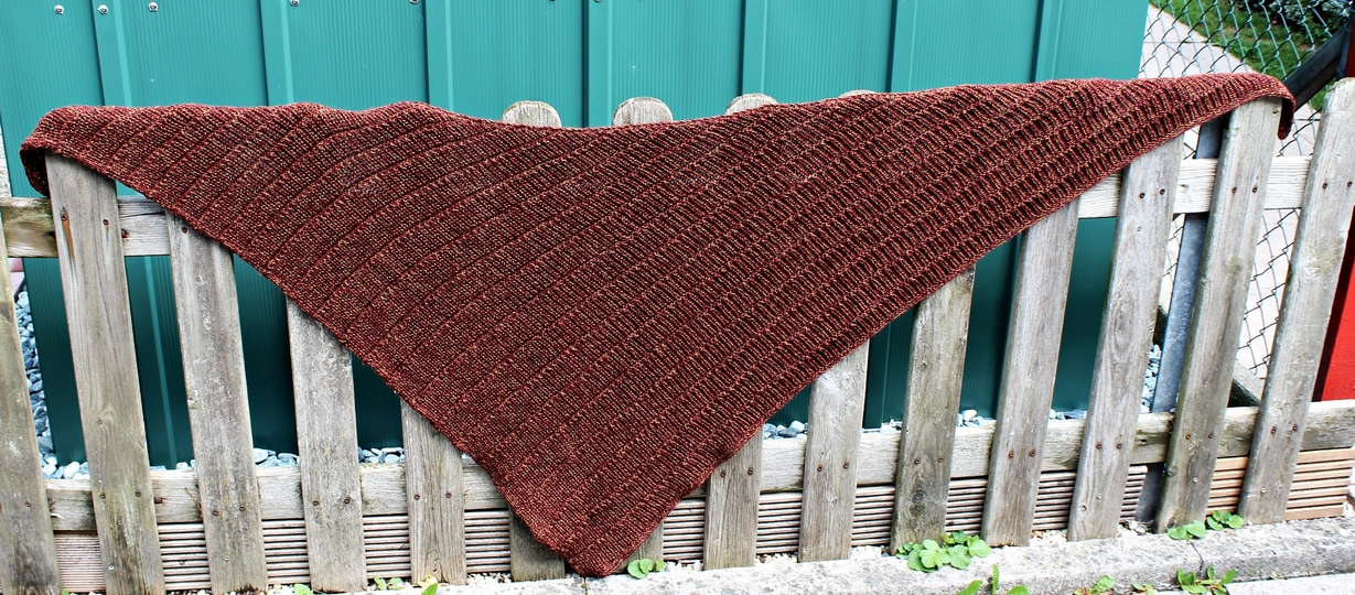 Das Tuch wird von der schmalen zur breiten Seite gestrickt und erhält seine Form durch seitliche Zunahmen.