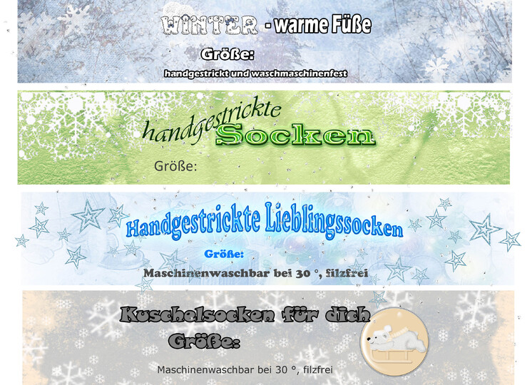 Damit die selbstgestrickten Socken auch ansprechend präsentiert werden können, egal ob zum Verschenken oder verkaufen, habe ich Banderolen entworfen. Diese Banderolen sind winterlich gestaltet.