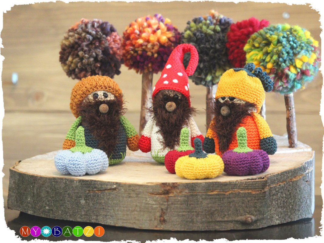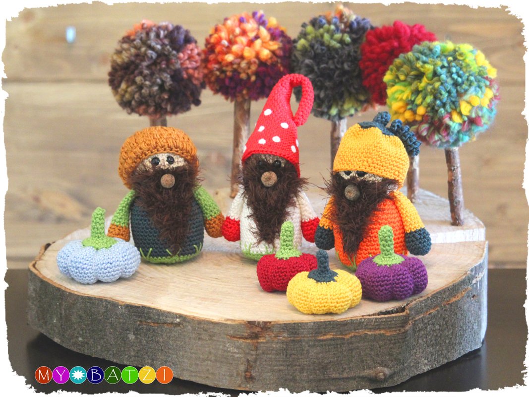 Willst du dir diese drei Wichtel auch häkeln? Dann hol dir doch am besten die Anleitung dazu. Sie ennthält viele Bilder und ausführliche Schritt-für-Schritt-Erklärungen. Sie ist deshalb auch von ambitionierten Anfängern gut nachzuabeiten. Außerdem wird in der Anleitung erklärt, wie die Kürbisse gehäkelt werden und, wie die Bäume gebastelt werden.